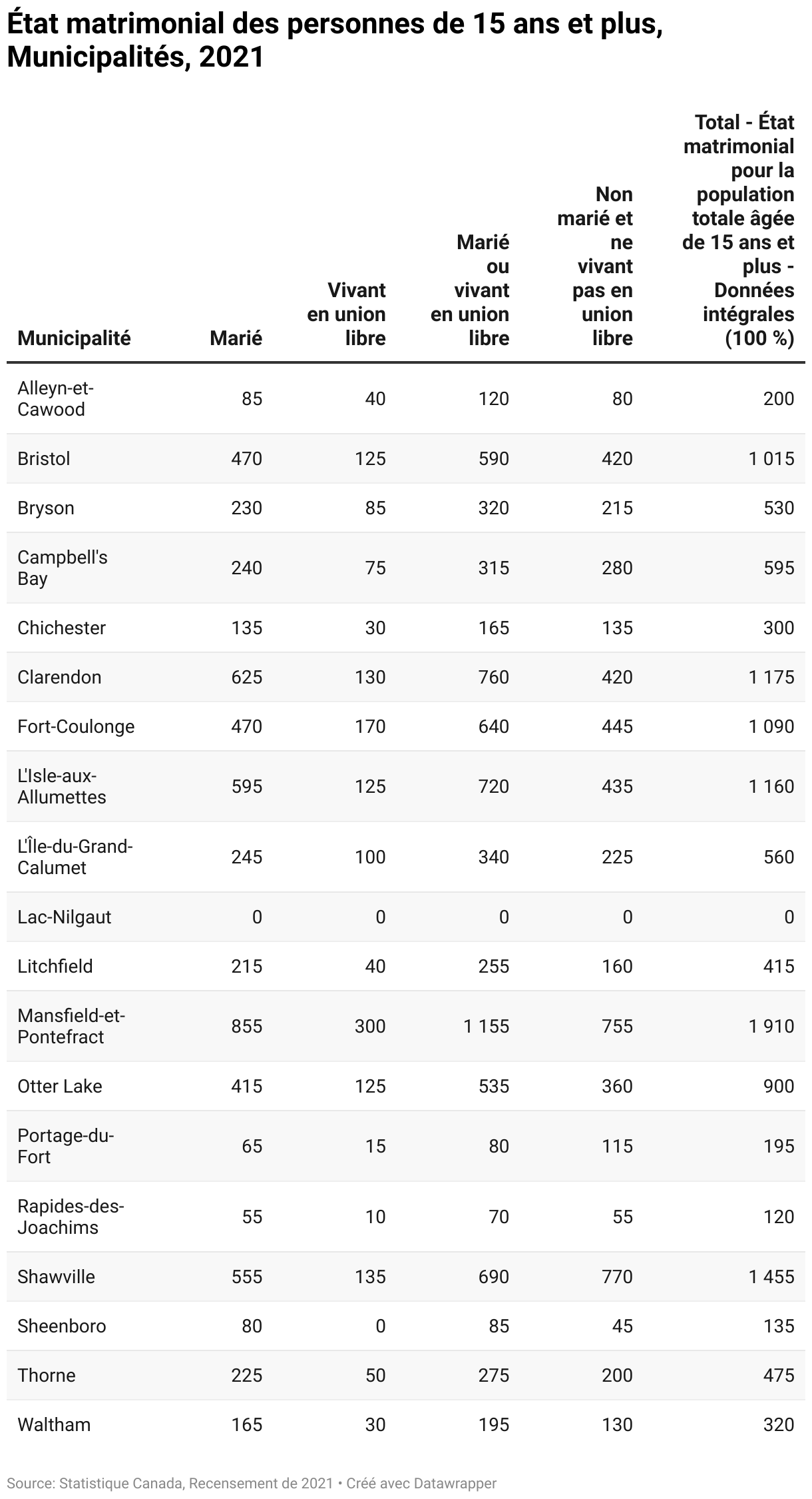 État matrimonial des personnes de 15 ans et plus, Municipalités, 2021