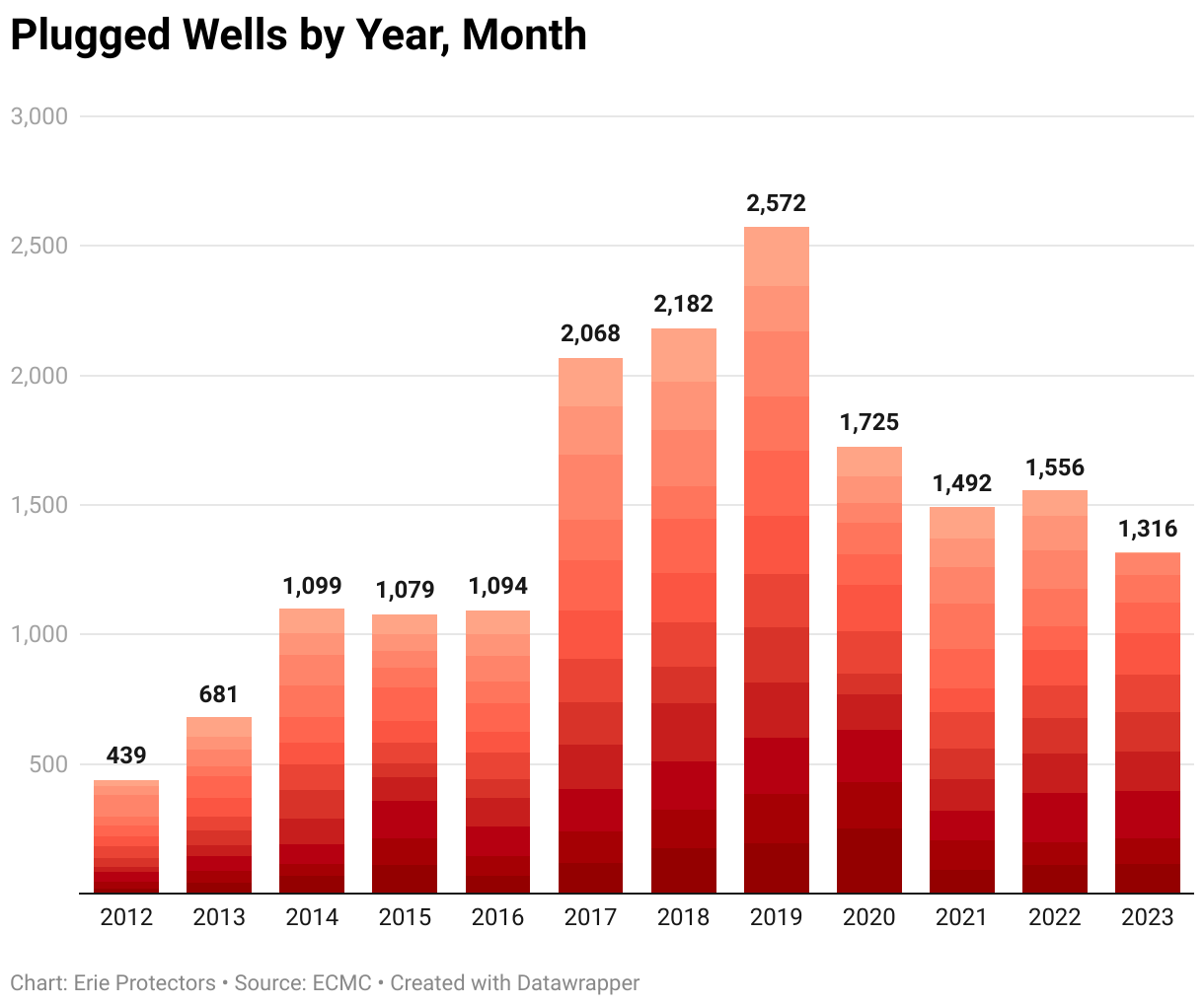 A chart showing the number of wells that were plugged and abandoned in the state of Colorado since 2012.