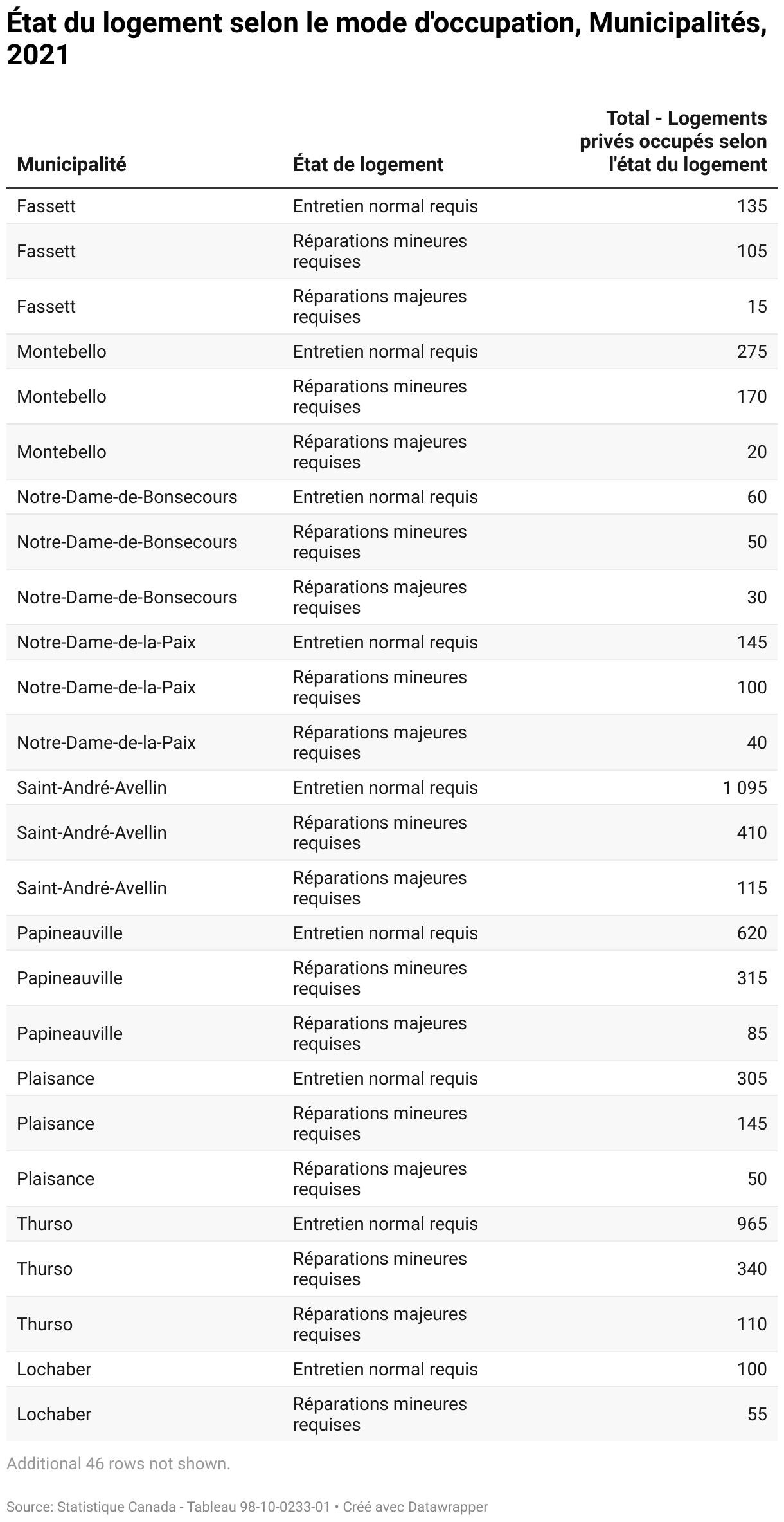 État du logement selon le mode d'occupation, Municipalités, 2021
