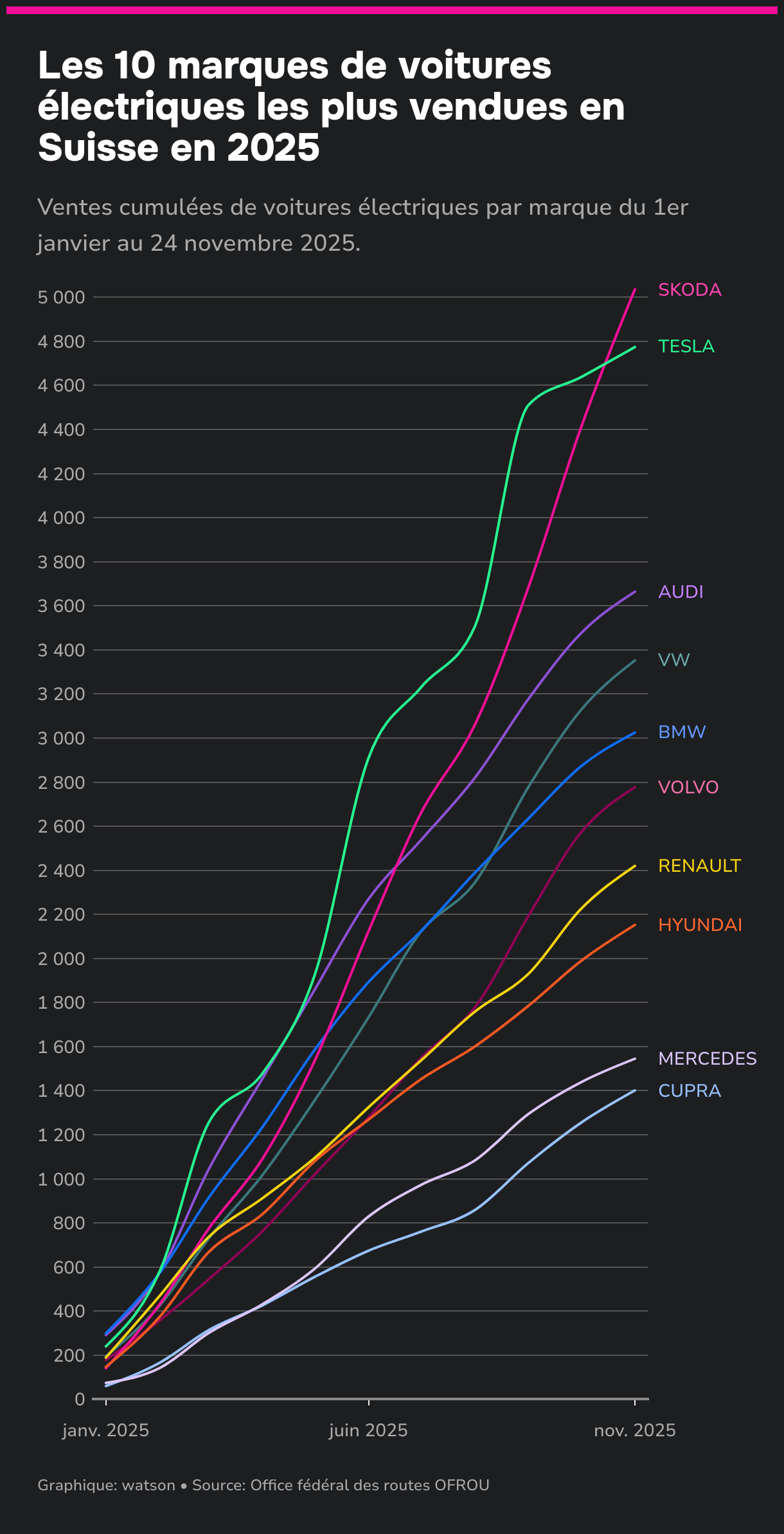 Ventes cumulées de voitures électriques par marque du 1er janvier au 24 novembre 2025.