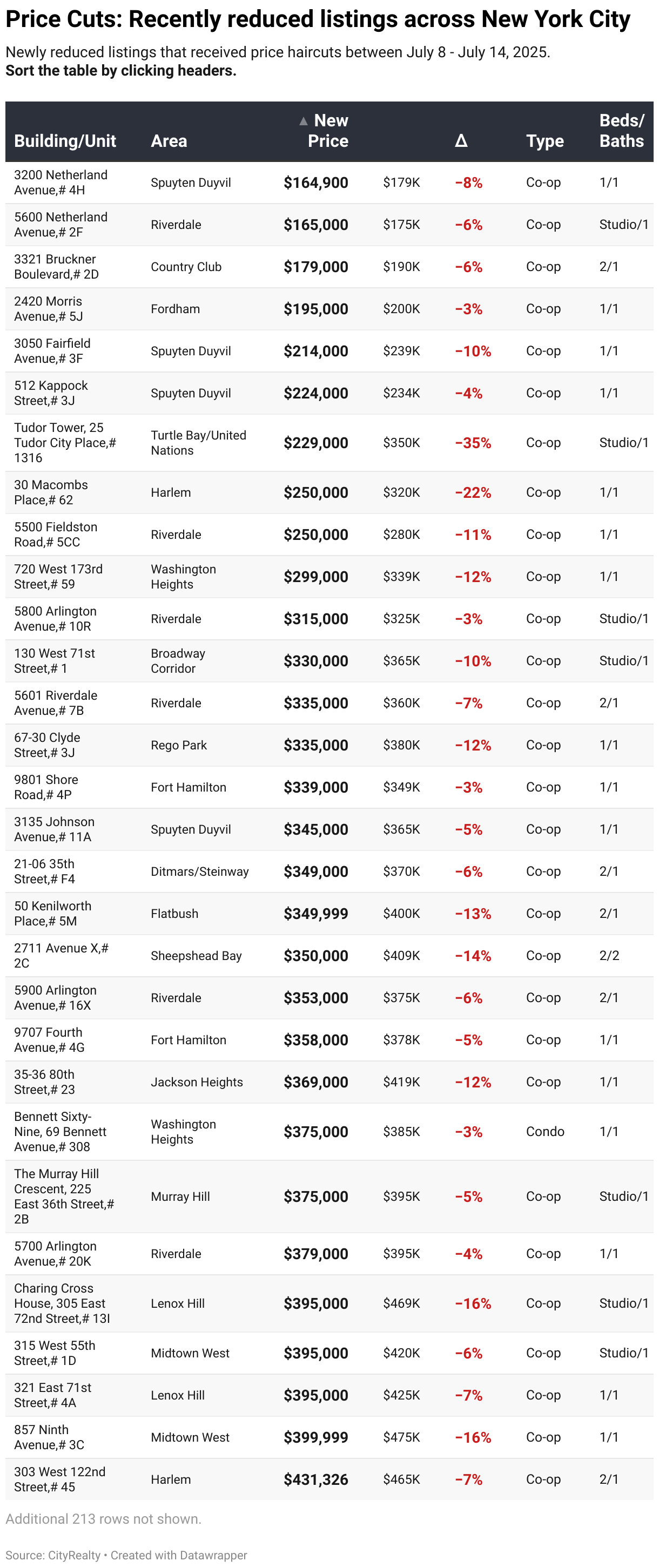 Newly reduced listings that received price haircuts between July 8 - July 14, 2025. Sort the table by clicking headers.