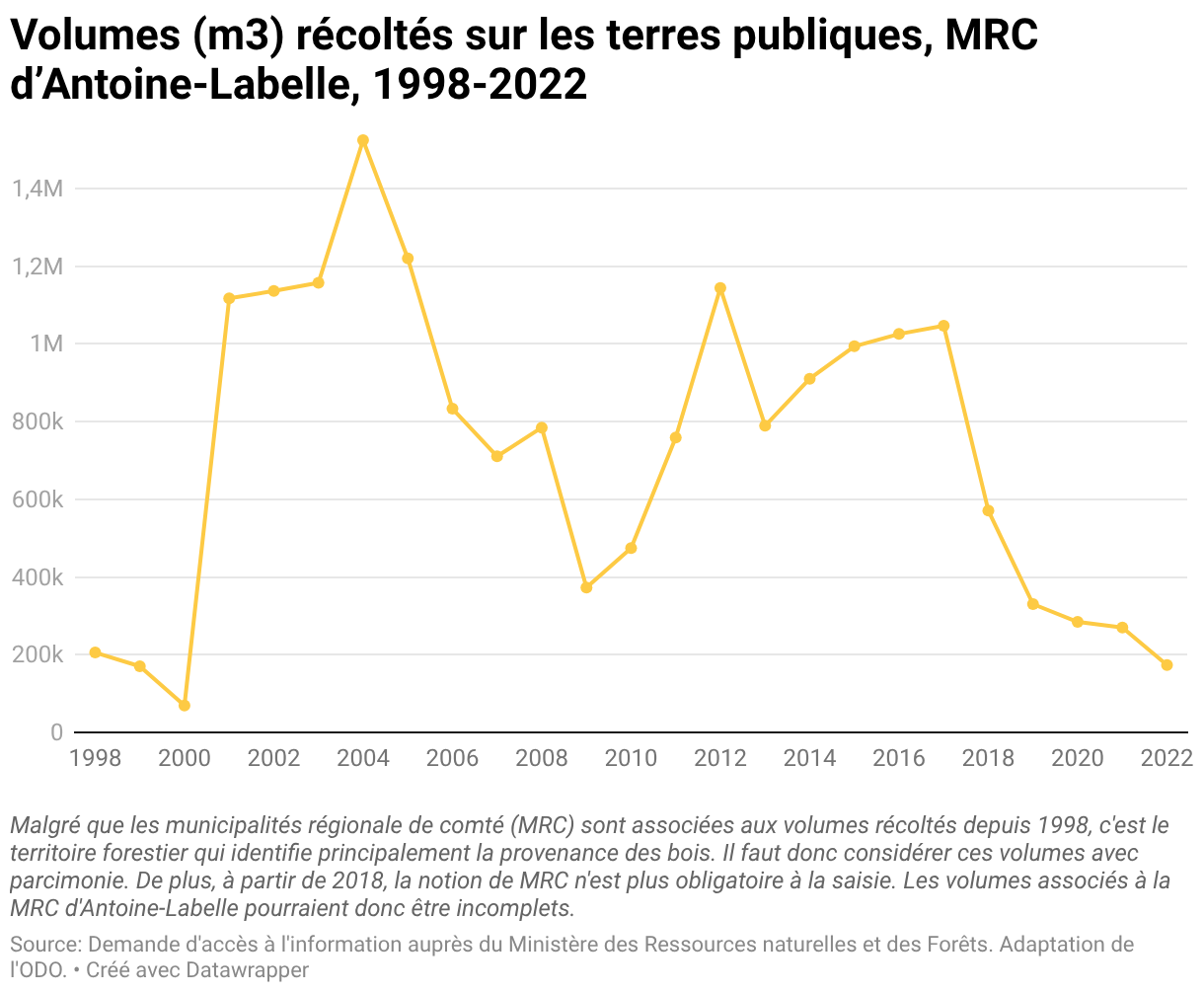 Volumes (m3) récoltés sur les terres publiques, MRC d’Antoine-Labelle, 1998-2022