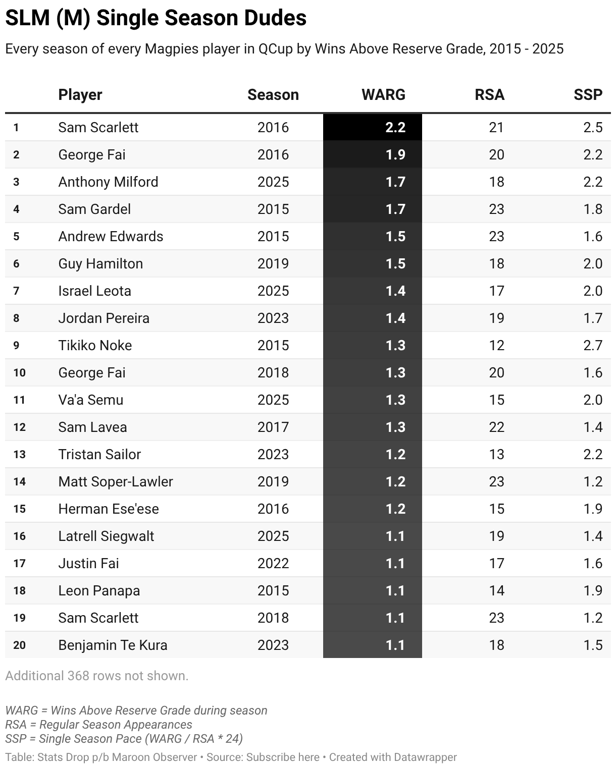 Every season of every Magpies player in QCup by Wins Above Reserve Grade, 2015 - 2025