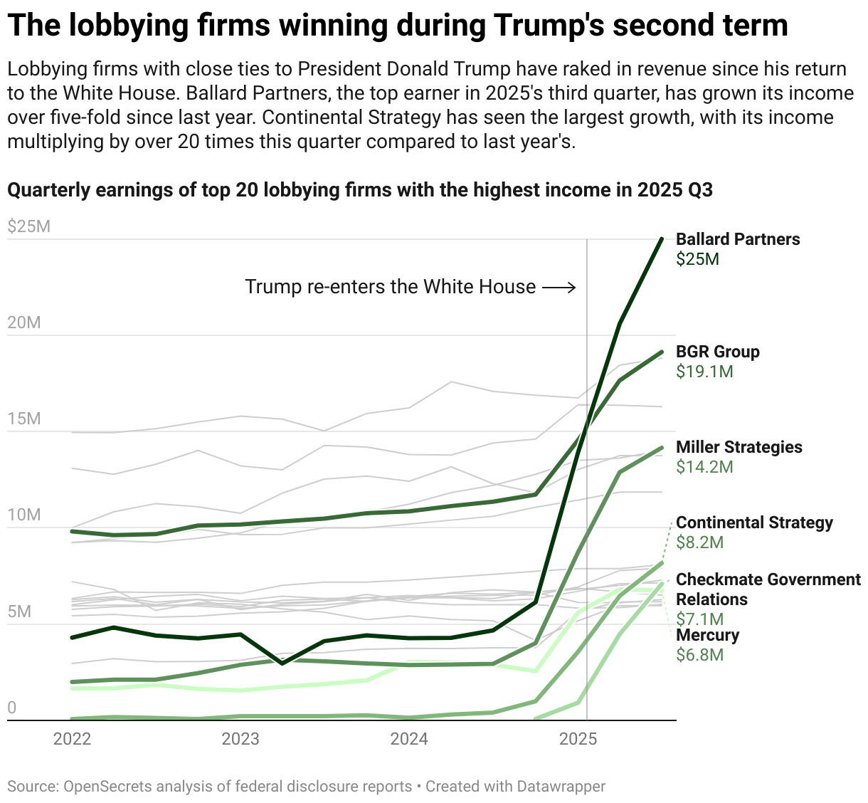 Lobbying firms with close ties to President Donald Trump have raked in revenue since his return to the White House. Ballard Partners, the top earner in 2025's third quarter, has grown its income over five-fold since last year. Continental Strategy has seen the largest growth, with its income multiplying by over 20 times this quarter compared to last year's.