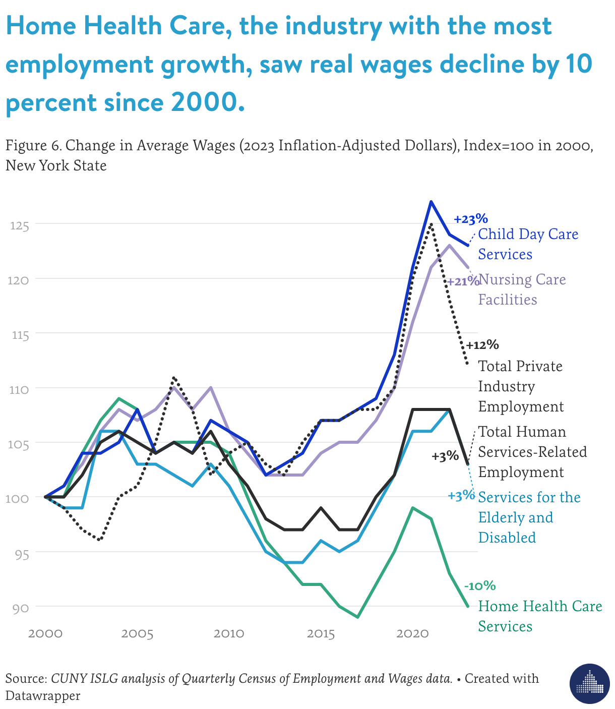 Home Health Care, the industry with the most employment growth, saw real wages decline by 10 percent since 2000.