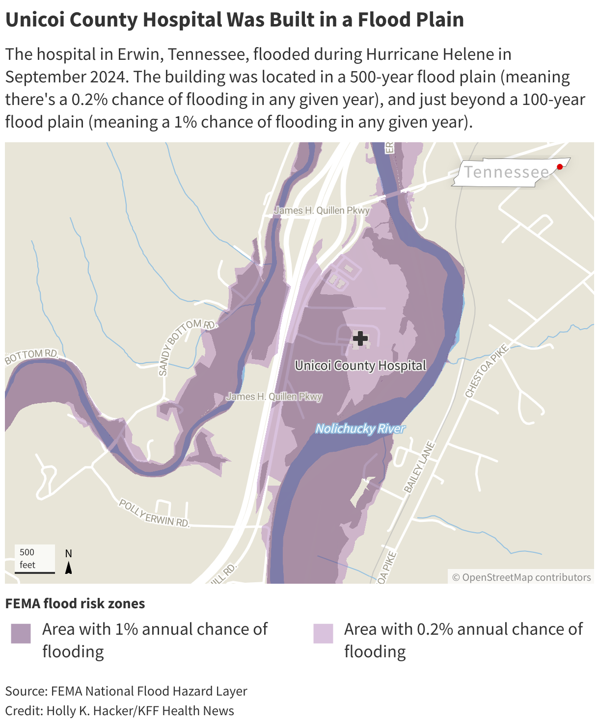 The hospital in Erwin, Tennessee, flooded during Hurricane Helene in September 2024. The building was located in a 500-year flood plain (meaning there's a 0.2% chance of flooding in any given year), and just beyond a 100-year flood plain (meaning a 1% chance of flooding in any given year).