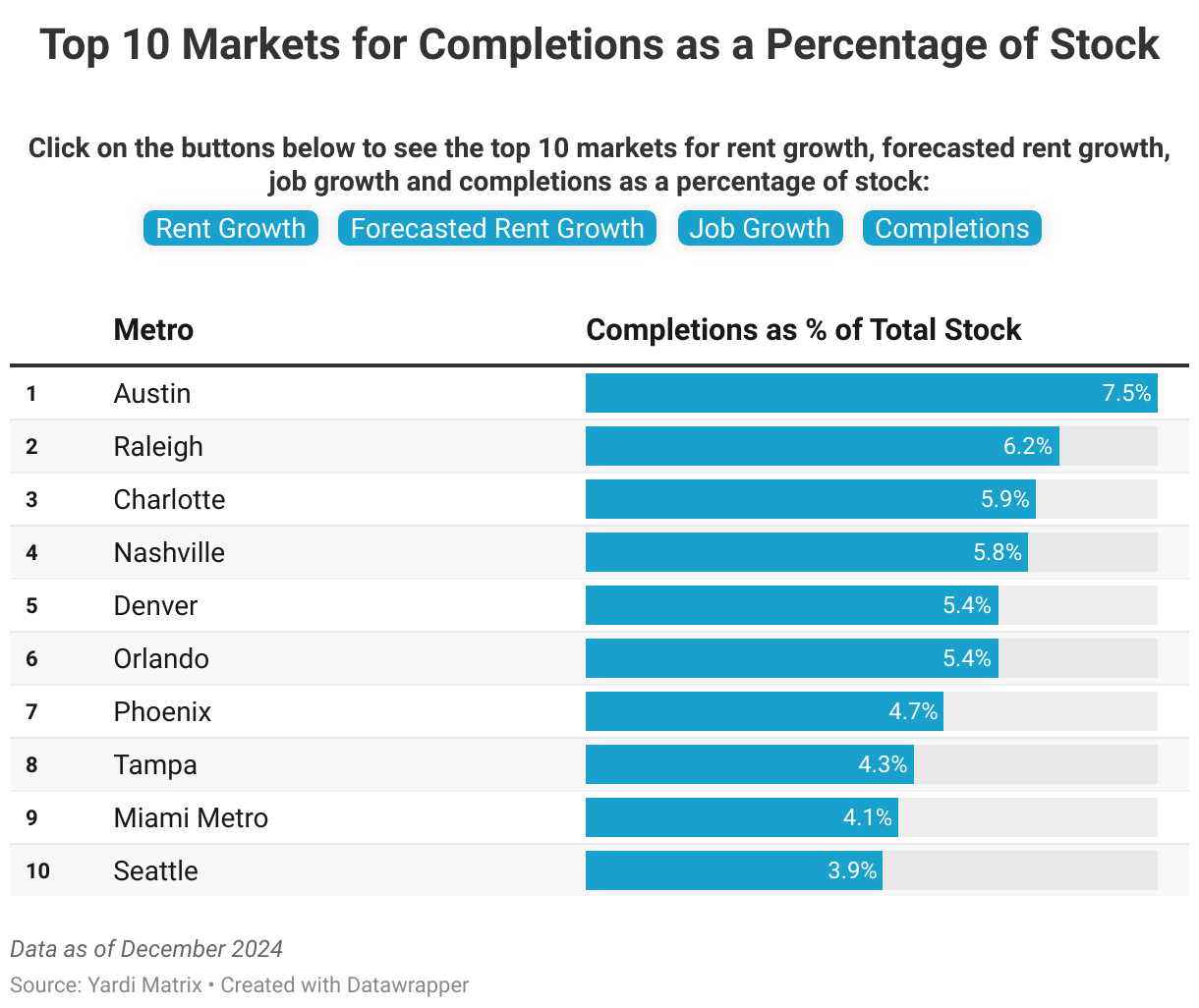 Click on the buttons below to see the top 10 markets for rent growth, forecasted rent growth, job growth and completions as a percentage of stock: