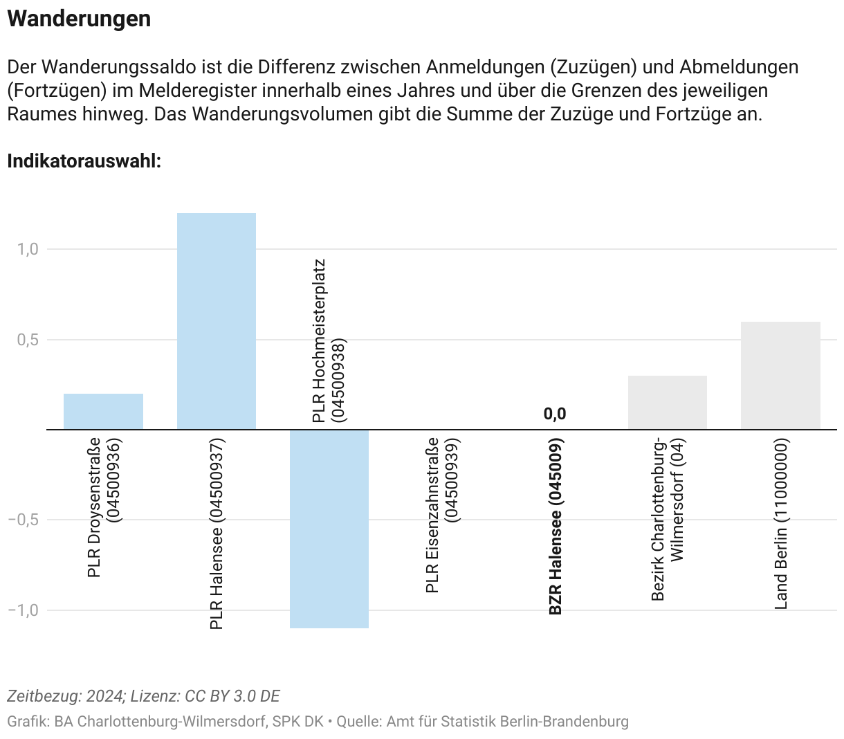 Der Wanderungssaldo ist die Differenz zwischen Anmeldungen (Zuzügen) und Abmeldungen (Fortzügen) im Melderegister innerhalb eines Jahres und über die Grenzen des jeweiligen Raumes hinweg. Das Wanderungsvolumen gibt die Summe der Zuzüge und Fortzüge an.