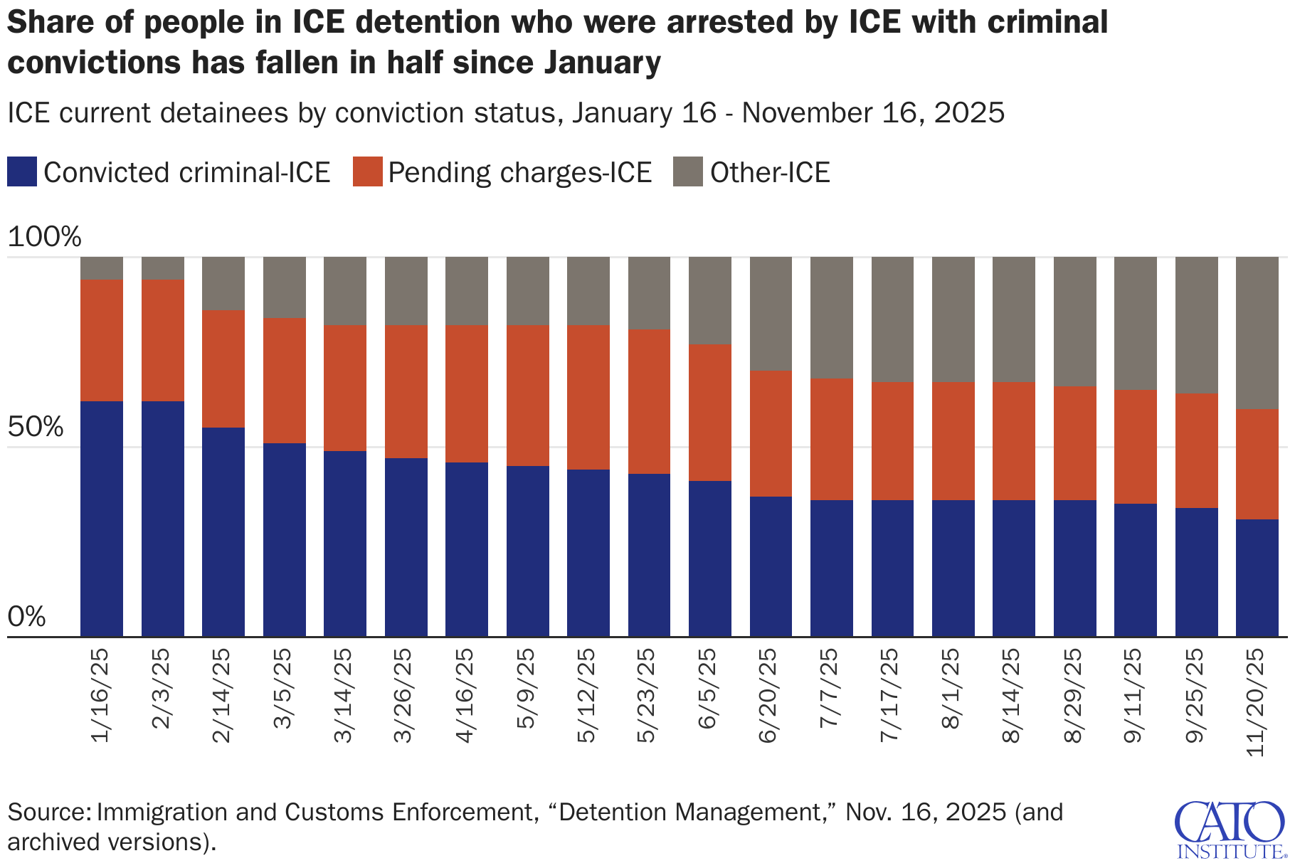 ICE current detainees by conviction status, January 16 - November 16, 2025
