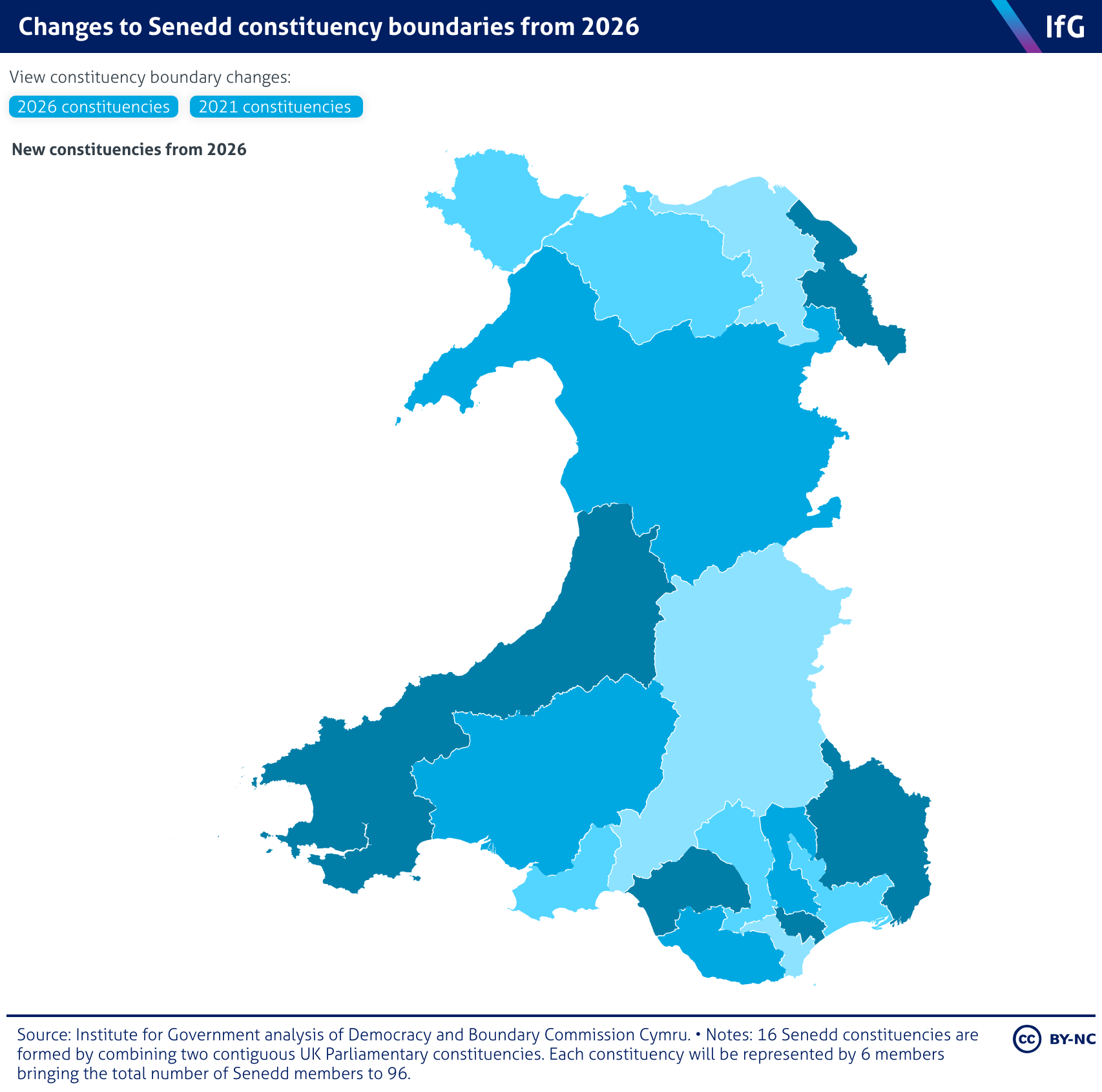 Map of Wales showing the boundaries of the 16 Senedd constituencies from the May 2026 election. The 16 Senedd constituencies are formed by combining two contiguous UK Parliamentary constituencies. Each constituency will be represented by 6 members bringing the total number of Senedd members to 96.