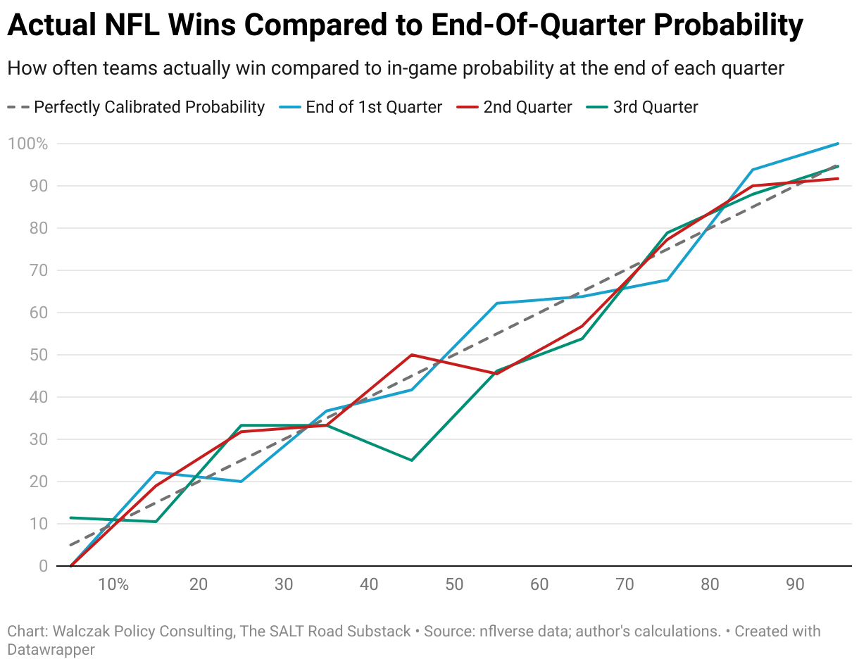 How often teams actually win compared to in-game probability at the end of each quarter