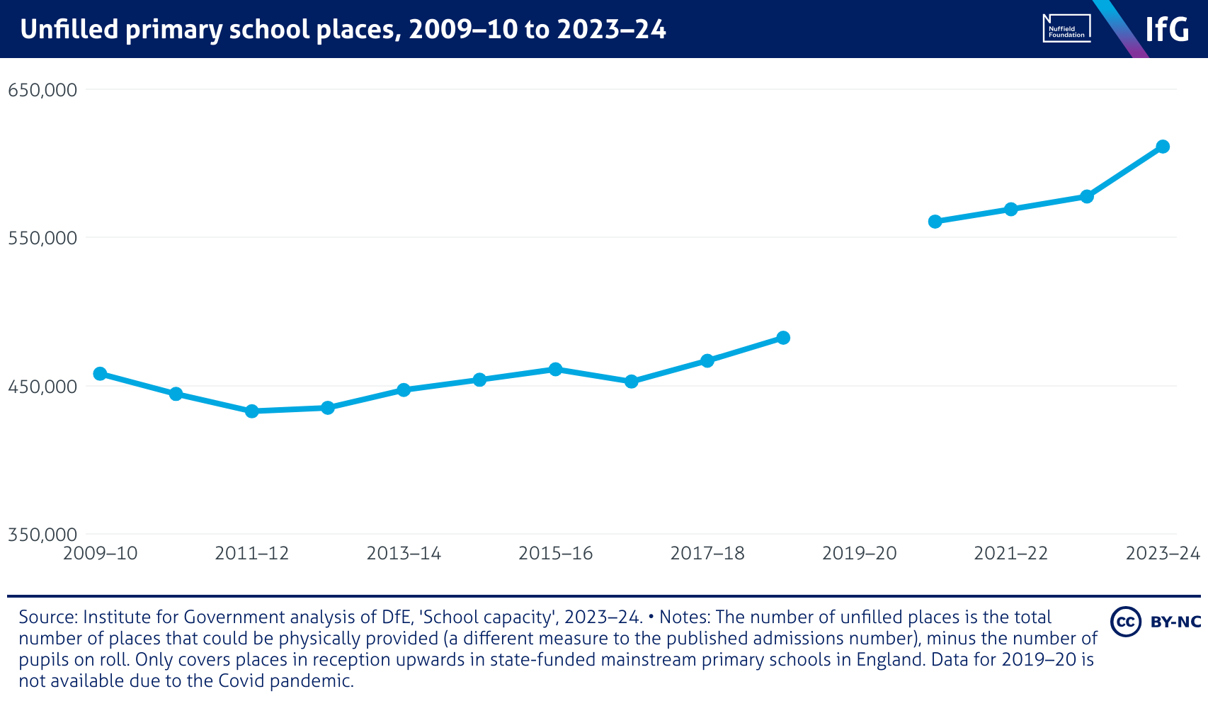 A line chart from the Institute for Government of unfilled primary school places, 2009–10 to 2023–24, where the number of vacant places has risen sharply in recent years. After remaining between 440,000–460,000 for much of the 2010s, unfilled places climbed to over 610,000 in 2023–24 - the highest level on record.