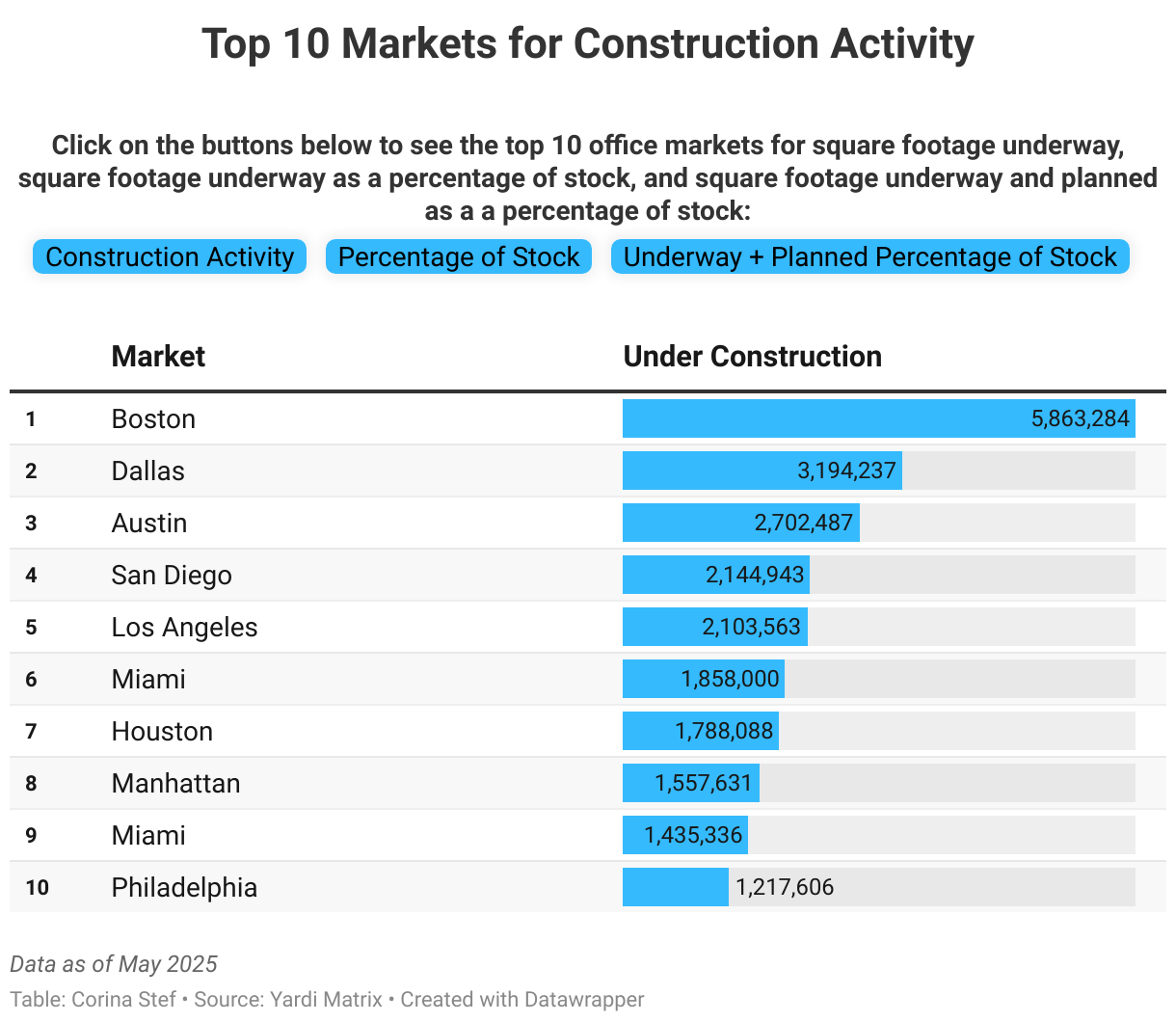 Click on the buttons below to see the top 10 office markets for square footage underway, square footage underway as a percentage of stock, and square footage underway and planned as a a percentage of stock: