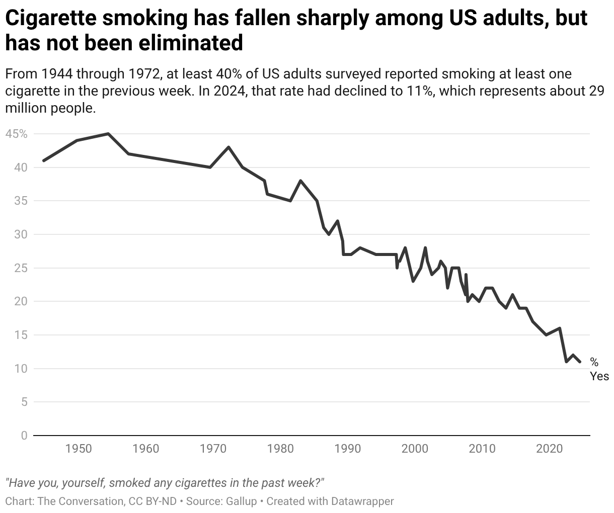 From 1944 through 1972, at least 40% of US adults surveyed reported smoking at least one cigarette in the previous week. In 2024, that rate had declined to 11%, which represents about 29 million people.