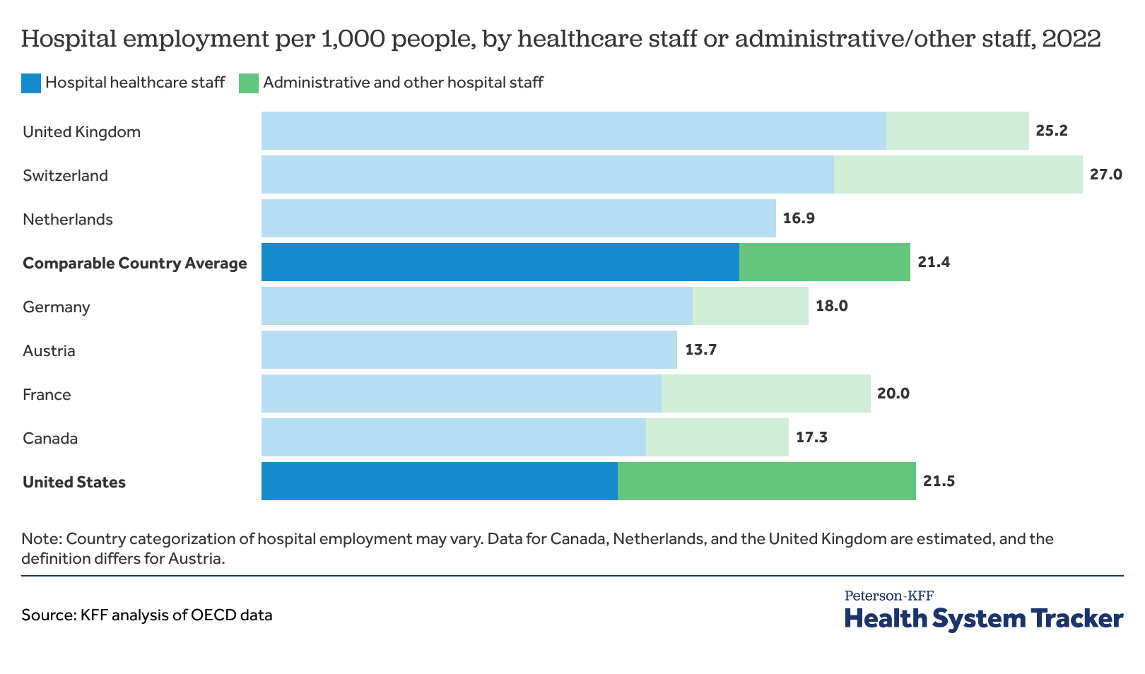 Hospital employment per 1,000 people, by healthcare staff or administrative/other staff, 2022