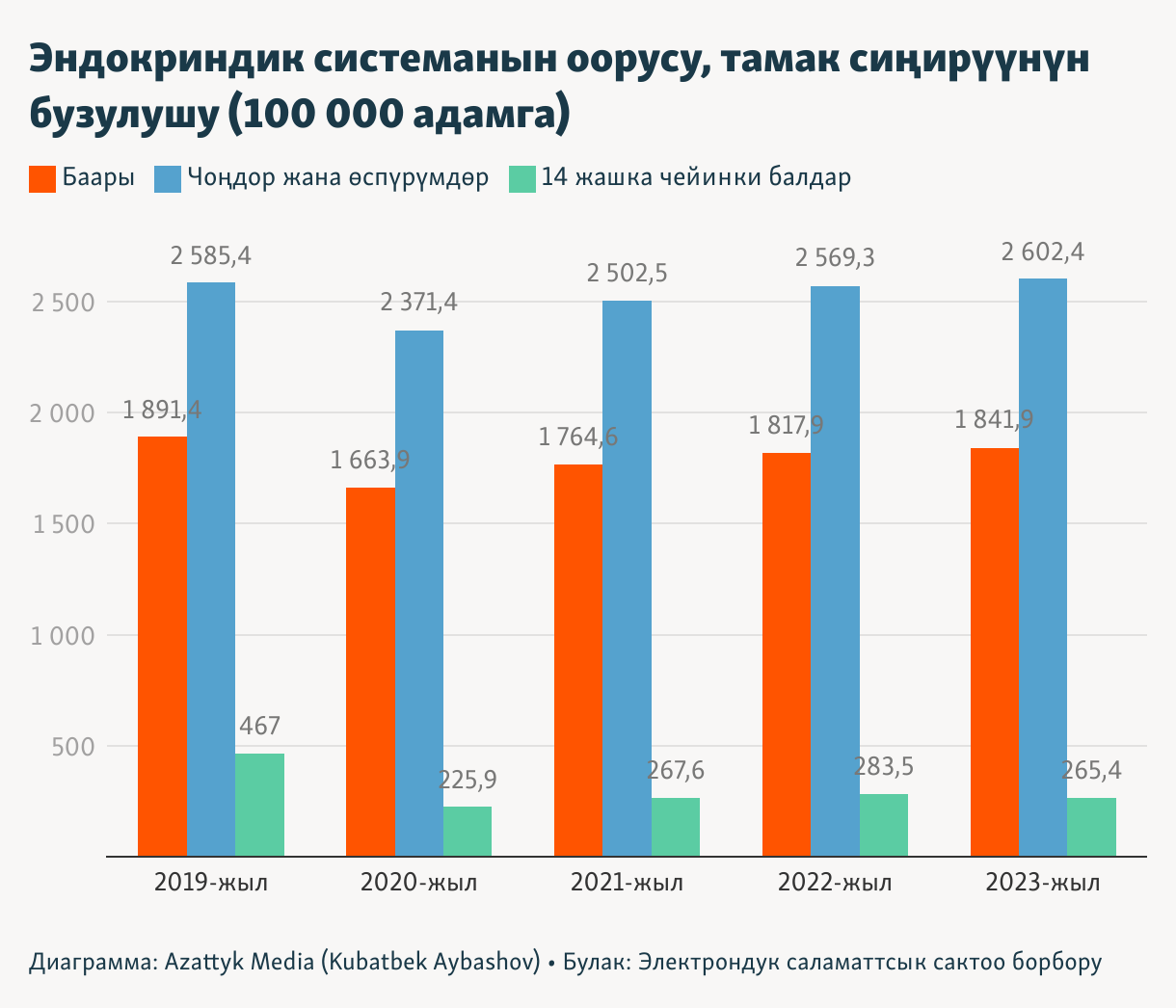 Эндокриндик системанын оорусу, тамак сиңирүүнүн бузулушу (100 000 адамга)