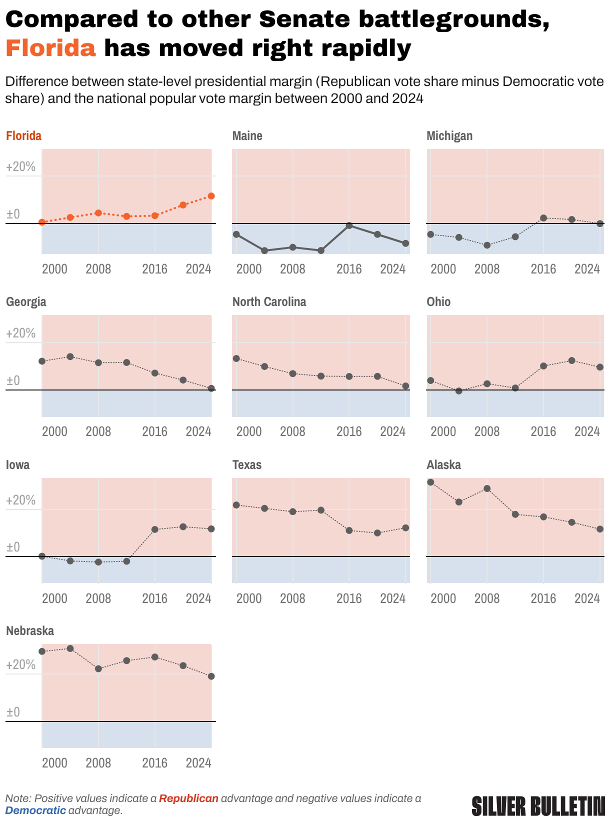 Difference between state-level presidential margin (Republican vote share minus Democratic vote share) and the national popular vote margin between 2000 and 2024