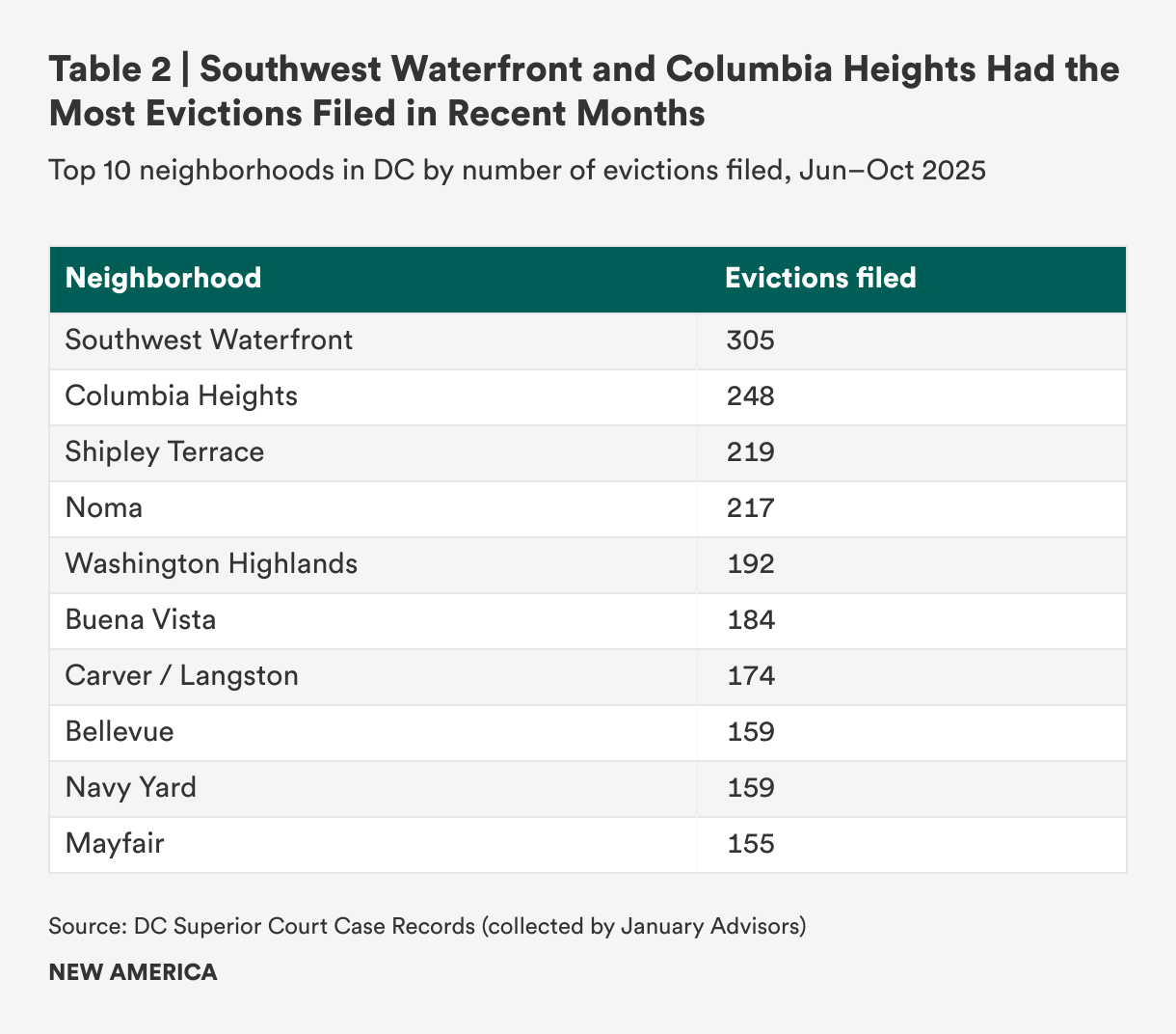 Table of the top 10 neighborhoods in DC with the most evictions Jun-Oct 2025 where Southwest Waterfront (305), Columbia Heights (248), and Shipley Terrace (219) have the most.