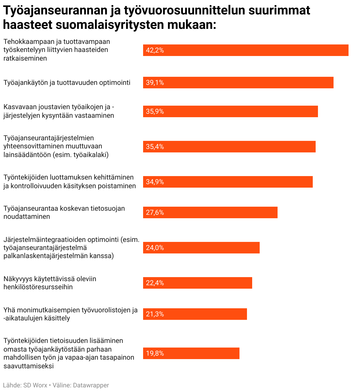 Työajanseurannan ja työvuorosuunnittelun suurimmat haasteet suomalaisyritysten mukaan: