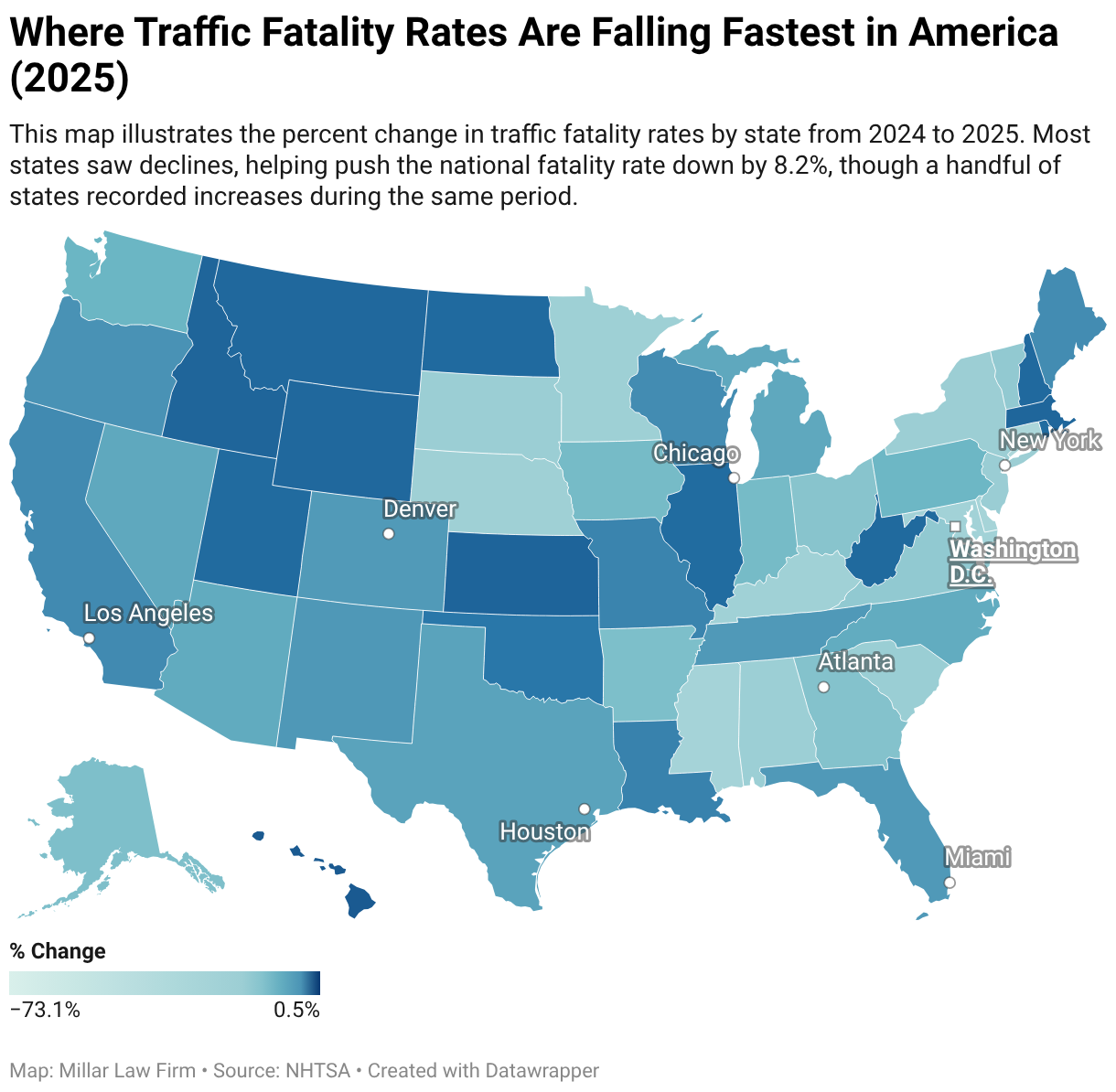 This map illustrates the percent change in traffic fatality rates by state from 2024 to 2025. Most states saw declines, helping push the national fatality rate down by 8.2%, though a handful of states recorded increases during the same period.