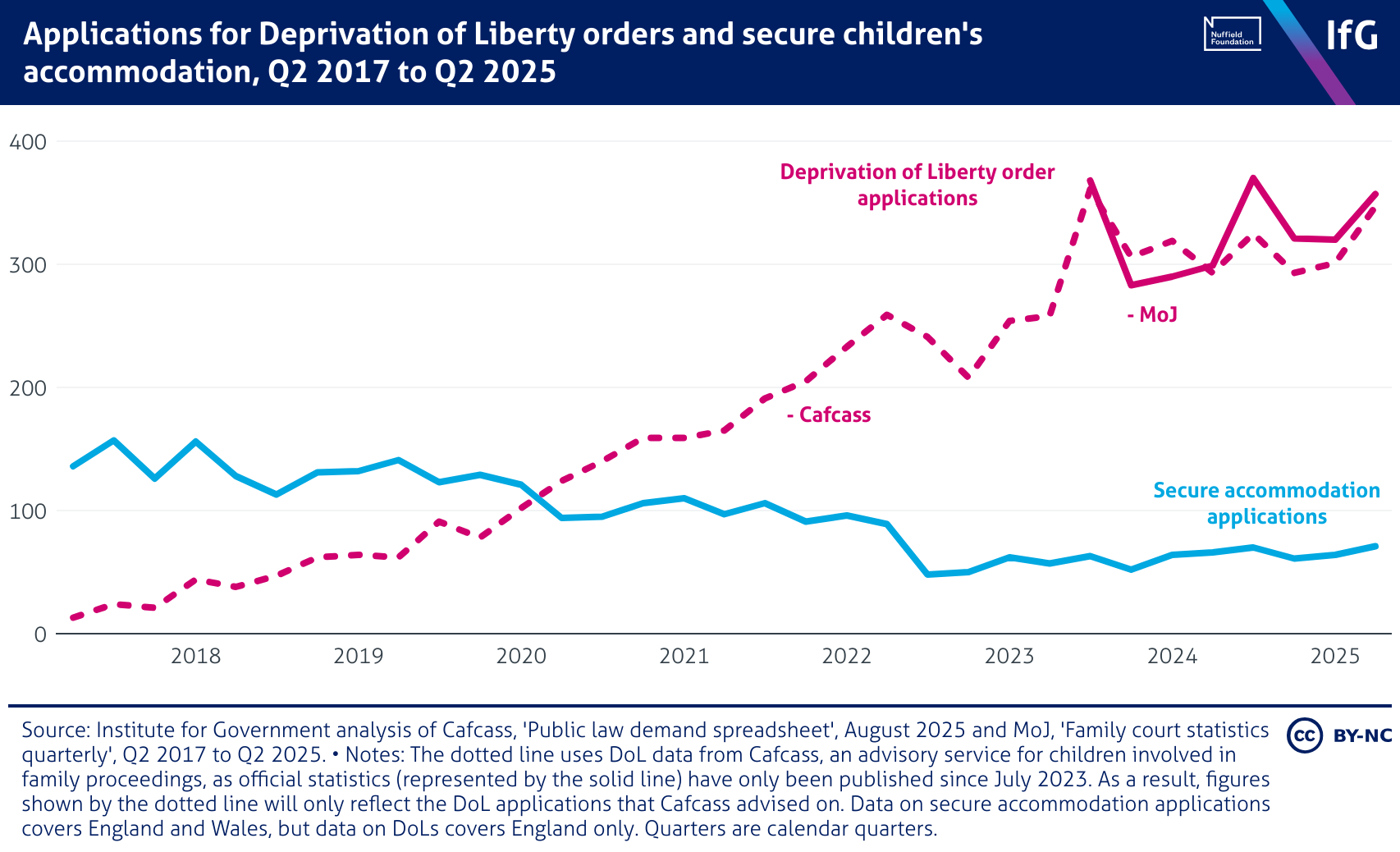 A line chart from the Institute for Government showing applications for Deprivation of Liberty orders and secure children's accommodation, Q2 2017 to Q2 2025, where deprivation of liberty order applications have risen steeply over the period, reaching 357 in Q2 2025, while secure accommodation applications have roughly halved, reaching 71 in Q2 2025.