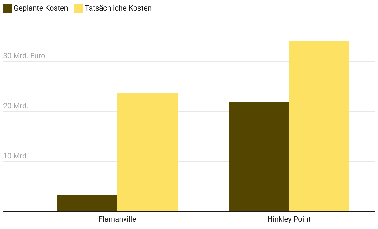 Die zwei jüngsten europäischen Atomkraftwerke in Frankreich und Großbritannien zeigen, wie unrealistisch die Kostenschätzungen der Projekte zu Beginn ausfallen.
