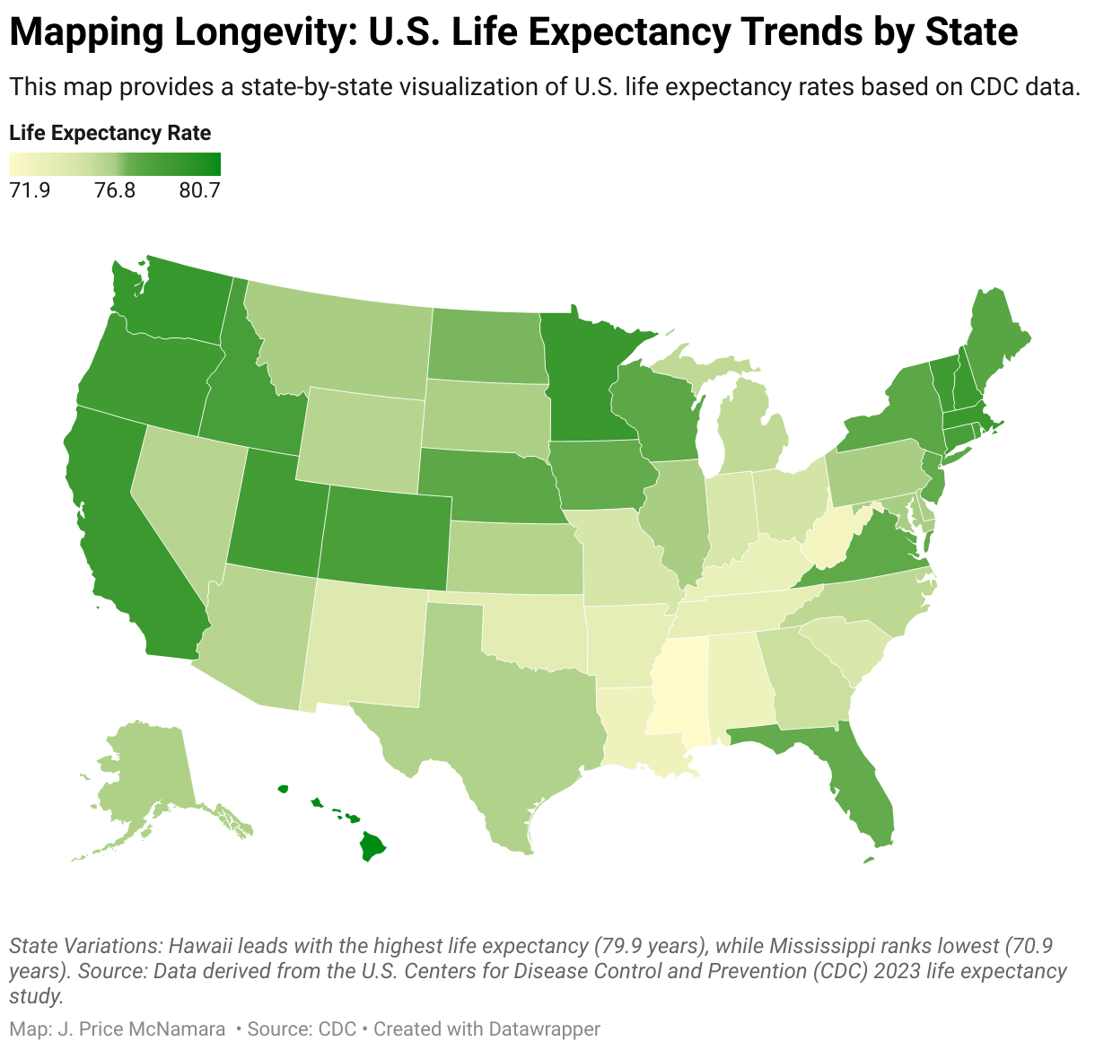 This map provides a state-by-state visualization of U.S. life expectancy rates based on CDC data.