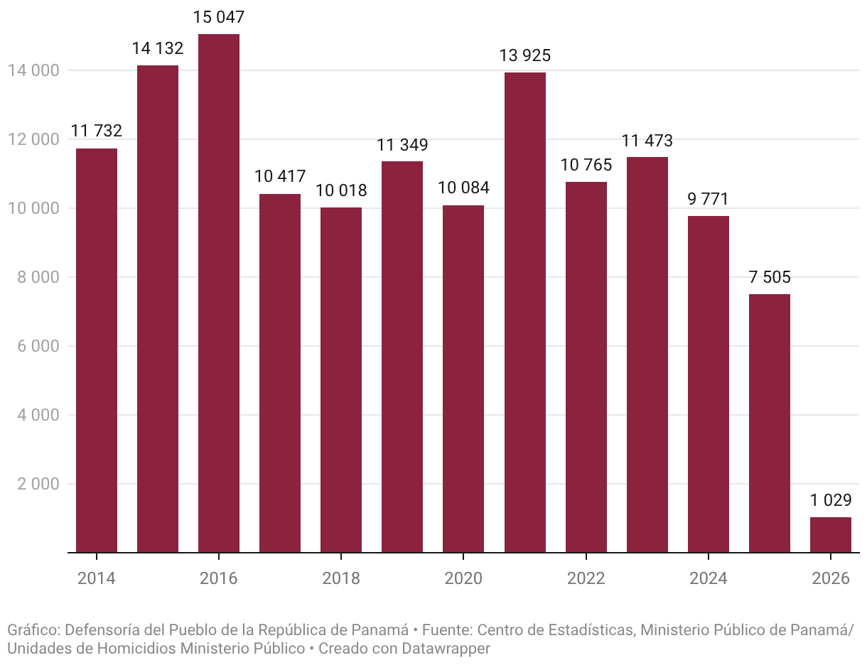Gráfico: Defensoría del Pueblo de la República de PanamáFuente: Centro de Estadísticas, Ministerio Público de Panamá/ Unidades de Homicidios Ministerio PúblicoDescargar los datosDescargar la imagenCreado con Datawrapper