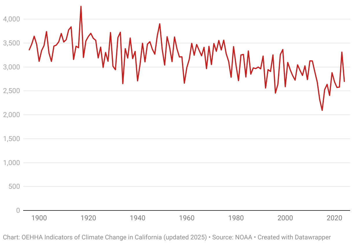 This line graph shows a decline in annual heating degree days from 1895 to 2024.