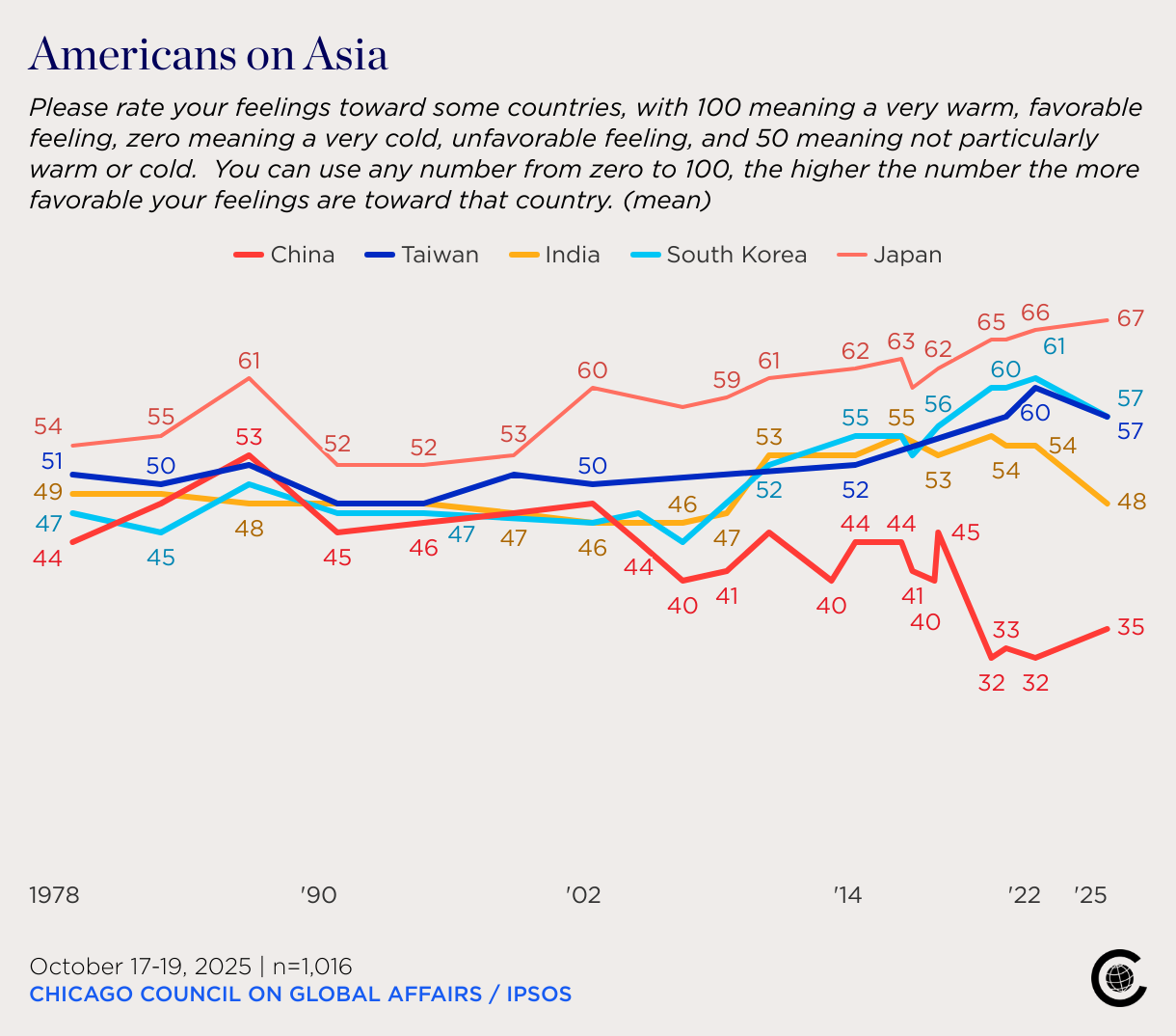 Please rate your feelings toward some countries, with 100 meaning a very warm, favorable feeling, zero meaning a very cold, unfavorable feeling, and 50 meaning not particularly warm or cold. You can use any number from zero to 100, the higher the number the more favorable your feelings are toward that country. (mean)