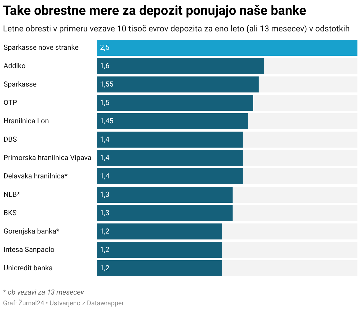 Letne obresti v primeru vezave 10 tisoč evrov depozita za eno leto (ali 13 mesecev) v odstotkih