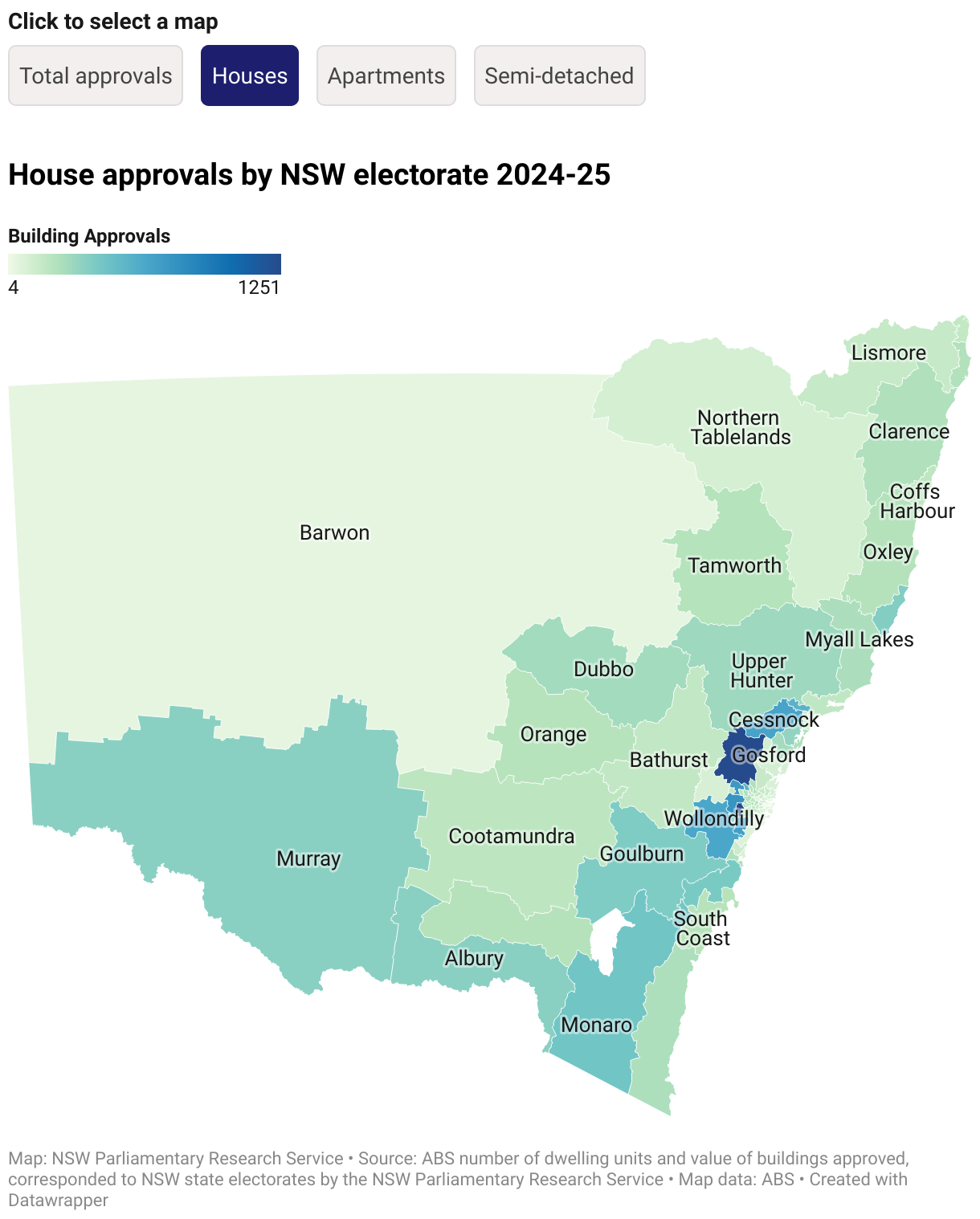 Click to select a map Total approvals Houses Apartments Semi-detached House approvals by NSW electorate 2024-25