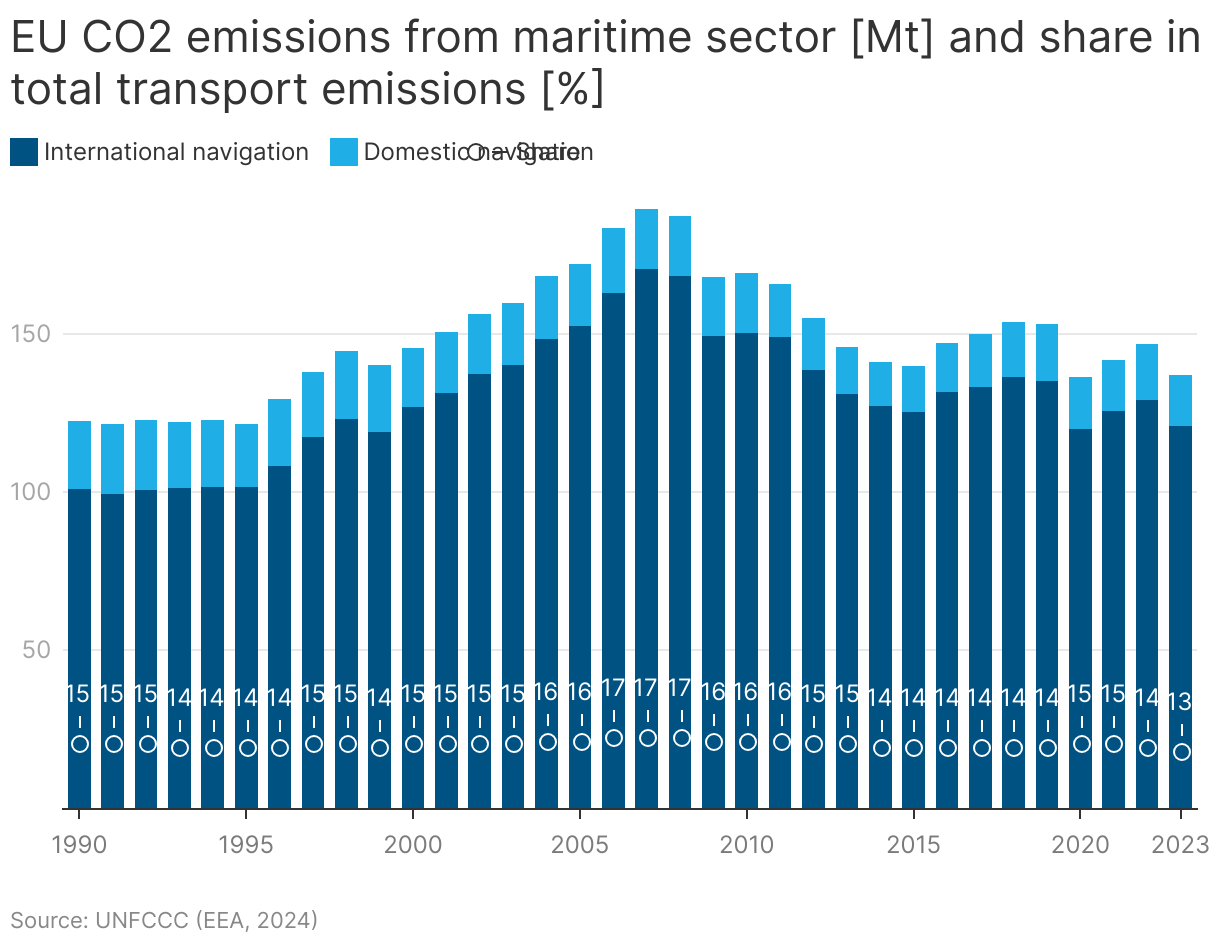 EU CO2 emissions from maritime sector [Mt] and share in total transport emissions [%]