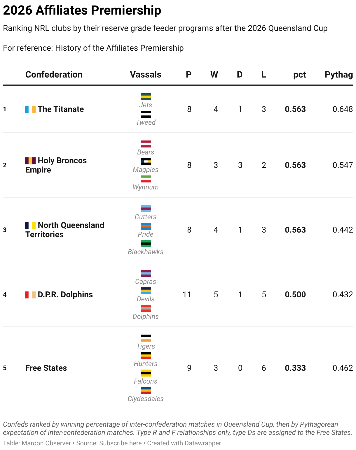 Ranking NRL clubs by their reserve grade feeder programs after the 2026 Queensland CupFor reference: History of the Affiliates Premiership
