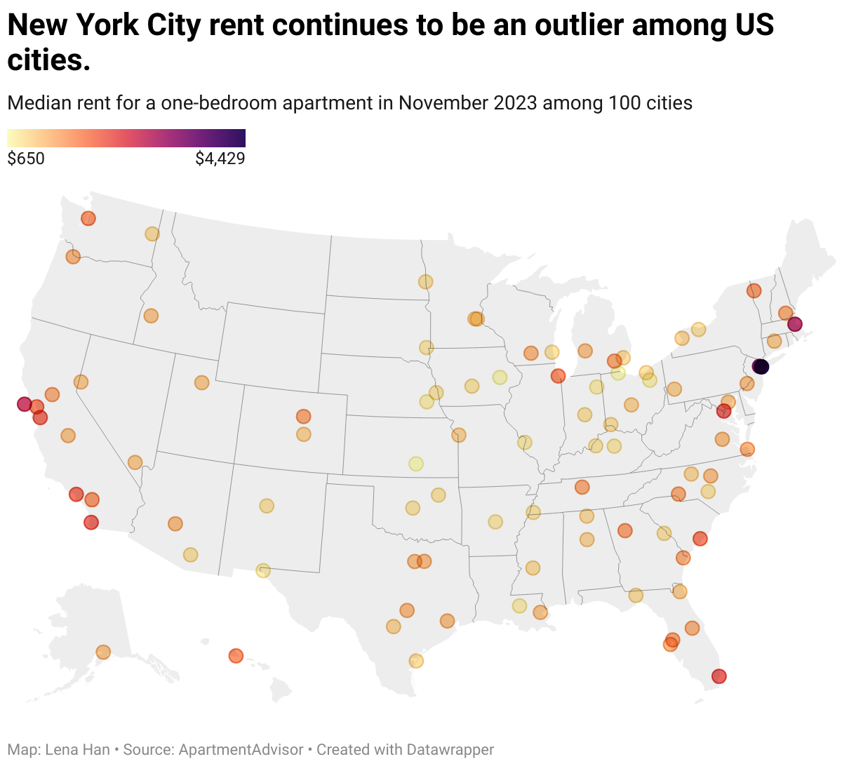 Median rent for a one-bedroom apartment in November 2023 among 100 cities