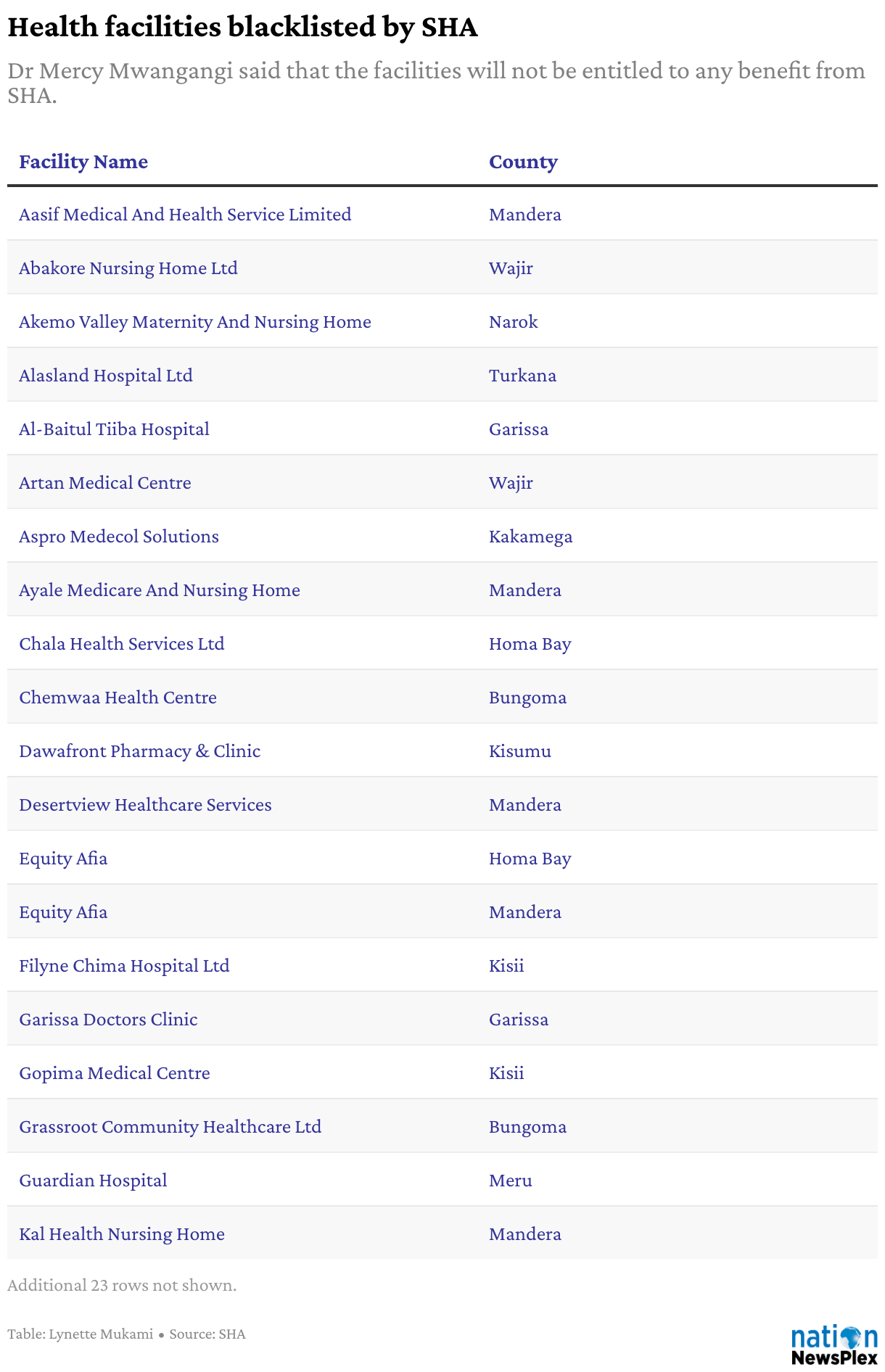Dr Mercy Mwangangi said that the facilities will not be entitled to any benefit from SHA.