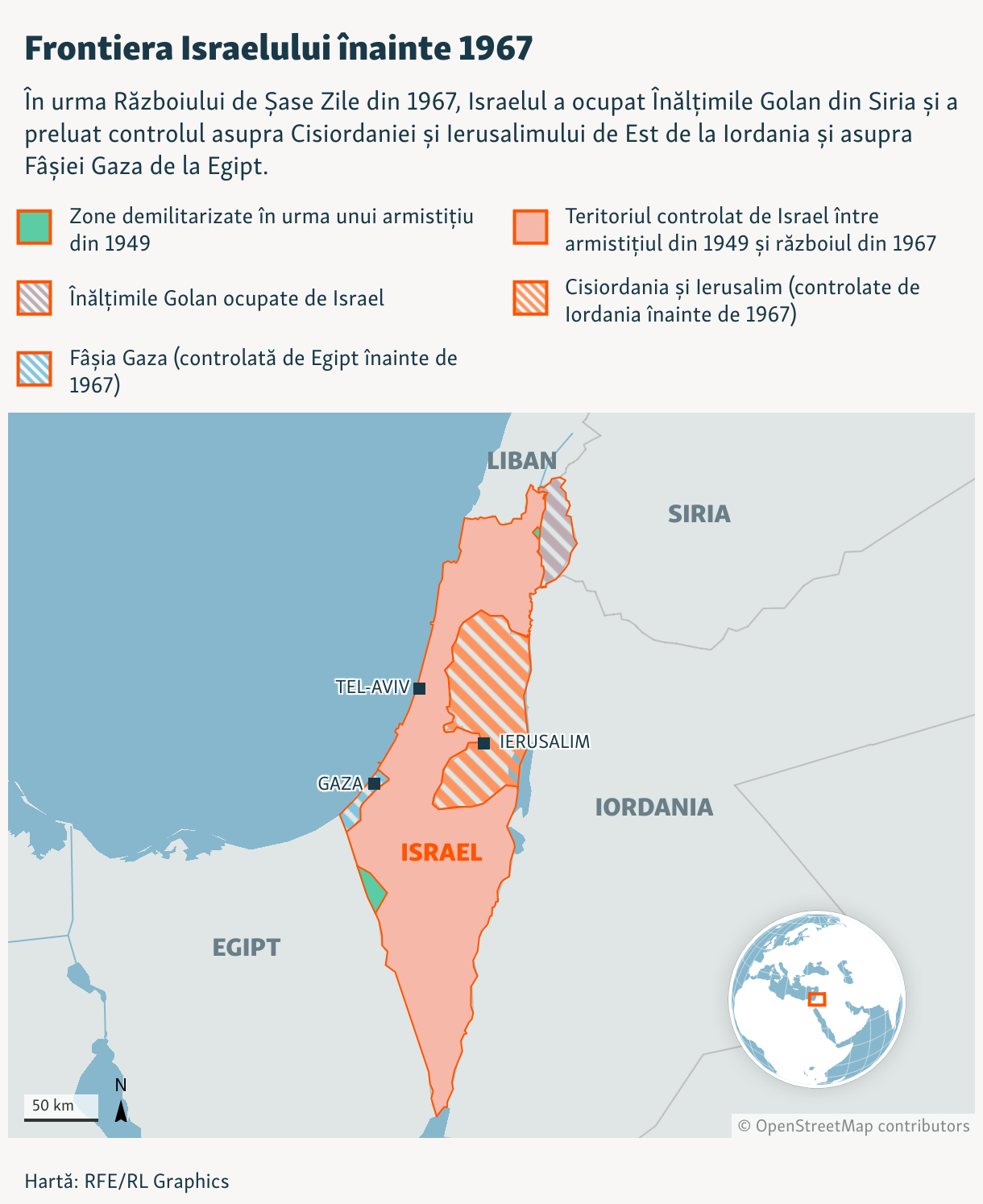 În urma Războiului de Șase Zile din 1967, Israelul a ocupat Înălțimile Golan din Siria și a preluat controlul asupra Cisiordaniei și Ierusalimului de Est de la Iordania și asupra Fâșiei Gaza de la Egipt.