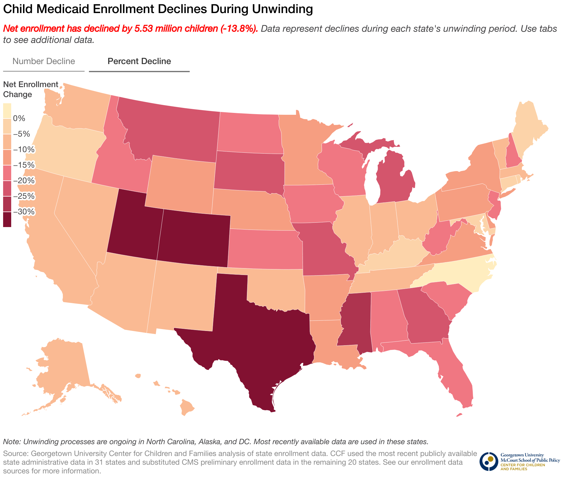 Net enrollment has declined by 5.53 million children (-13.8%). Data represent declines during each state's unwinding period. Use tabs to see additional data. Number Decline Percent Decline