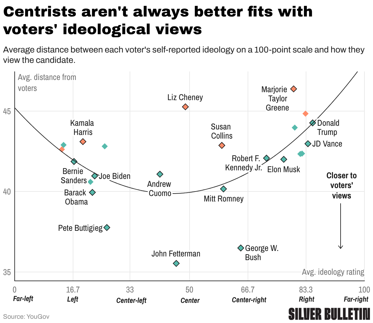Average distance between each voter's self-reported ideology on a 100-point scale and how they view the candidate.