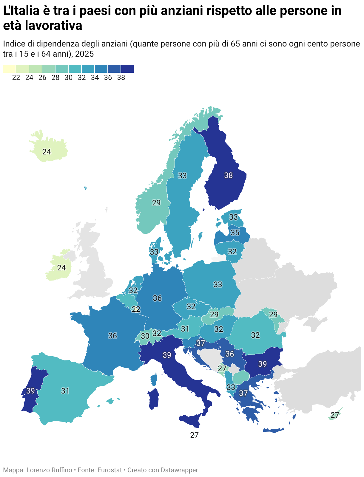 Indice di dipendenza degli anziani (quante persone con più di 65 anni ci sono ogni cento persone tra i 15 e i 64 anni), 2025