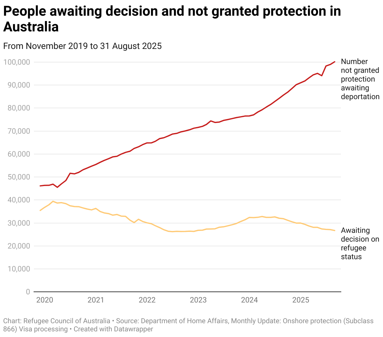 Stacked area chart showing number of people awaiting decision on refugee status and awaiting deportation over time. In the last month, there were 26715 people awaiting a decision and 100157 awaiting deportation.