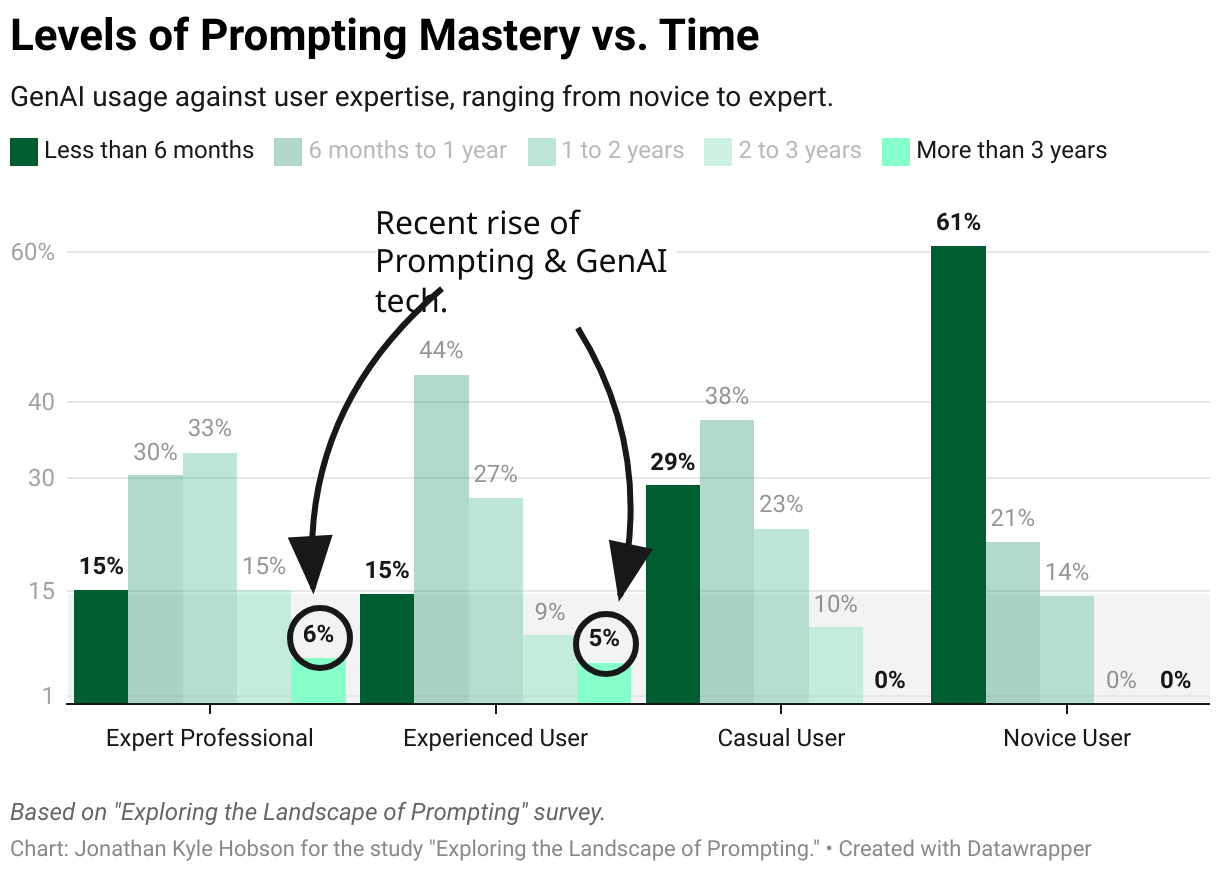 The bar chart displays groups based on their expertise in interacting with generative AI models, including large language models that generate text, images, sound, and other types of media. These AI models, like ChatGPT and Claude, involve technologies designed to produce generative content. The expertise levels are divided into novice, casual, experienced, and expert users.
