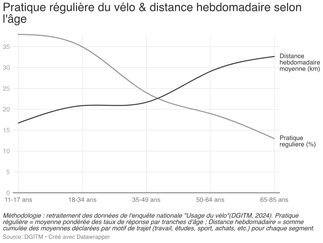 Pratique régulière du vélo & distance hebdomadaire selon l'âge