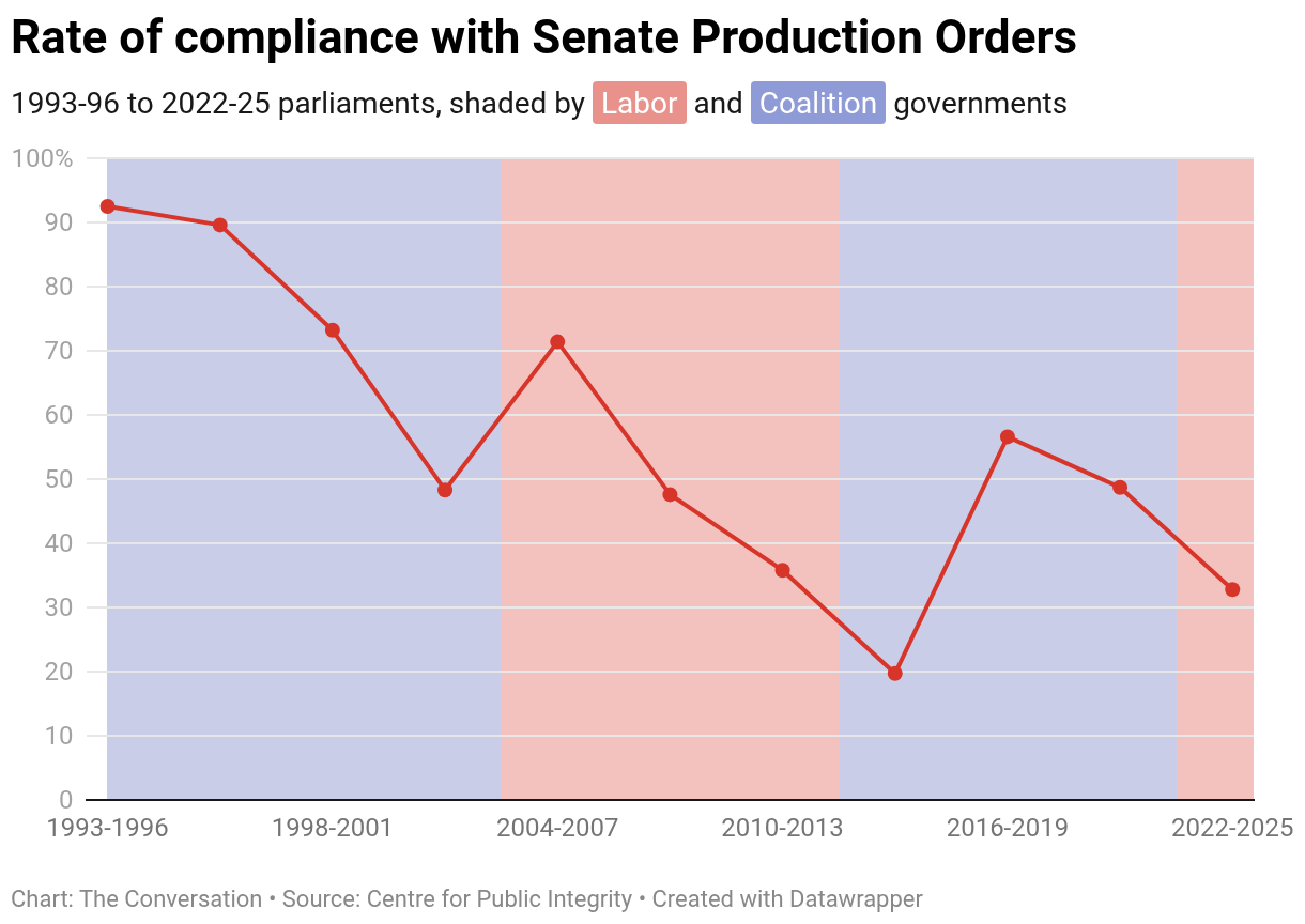 1993-96 to 2022-25 parliaments, shaded by Labor and Coalition governments
