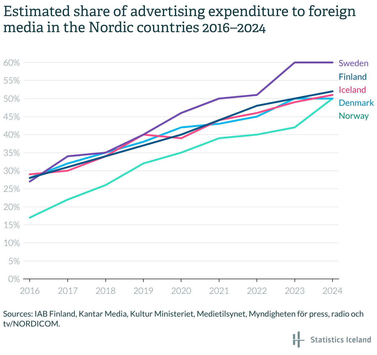 Estimated share of advertising expenditure to foreign media in the Nordic countries 2016–2024