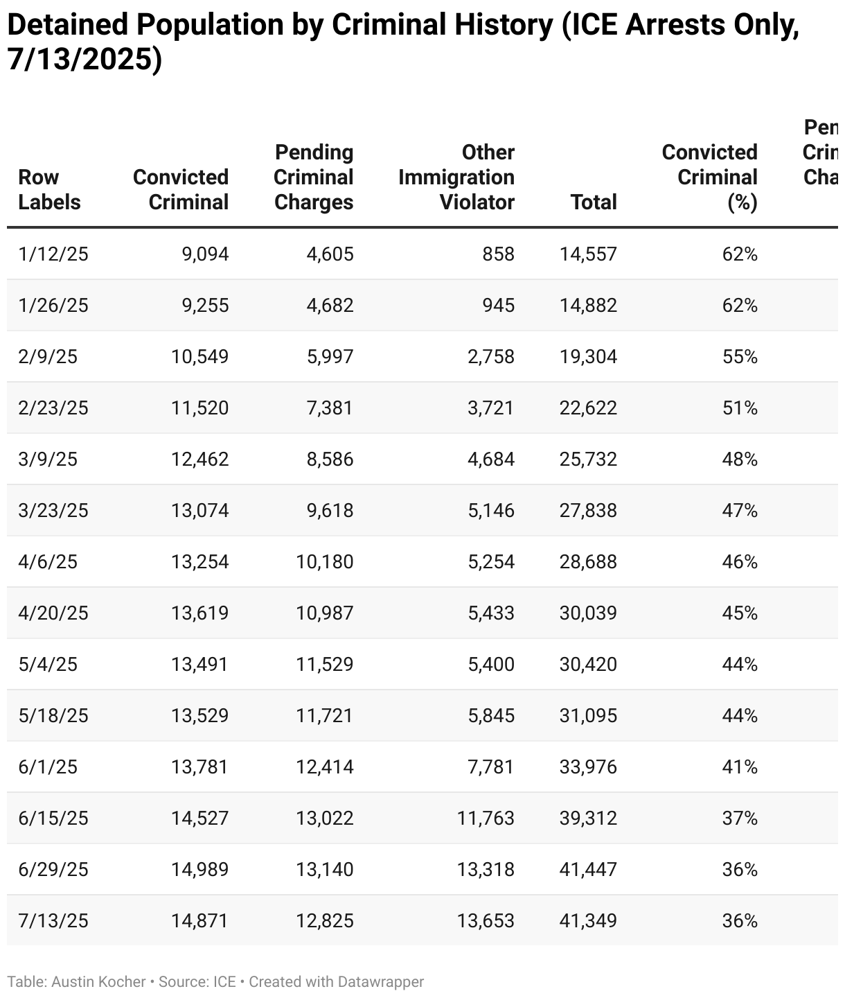 Detained Population by Criminal History (ICE Arrests Only, 7/13/2025)