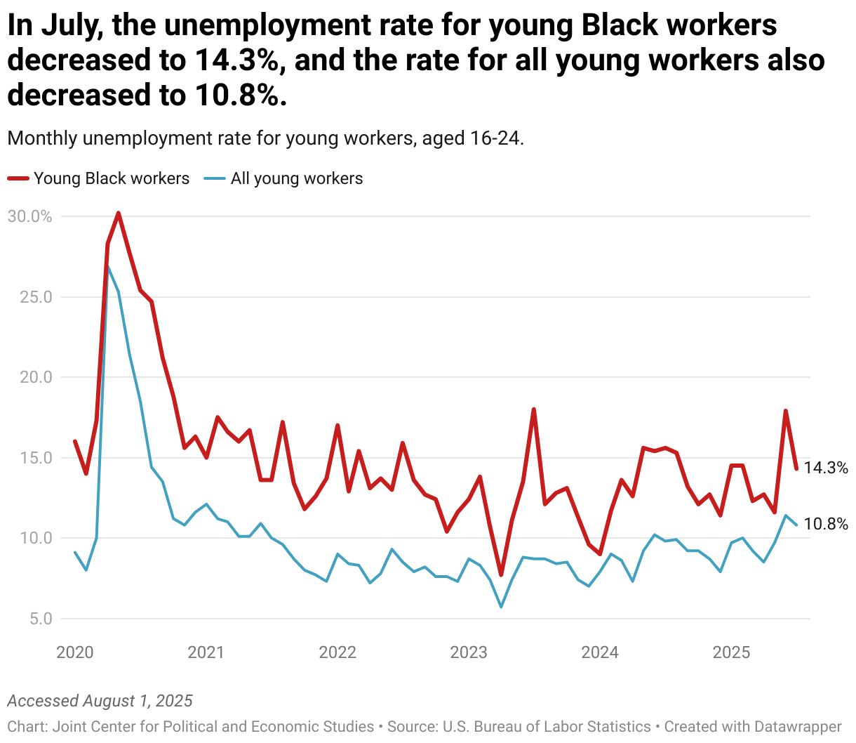 Monthly unemployment rate for young workers, aged 16-24.