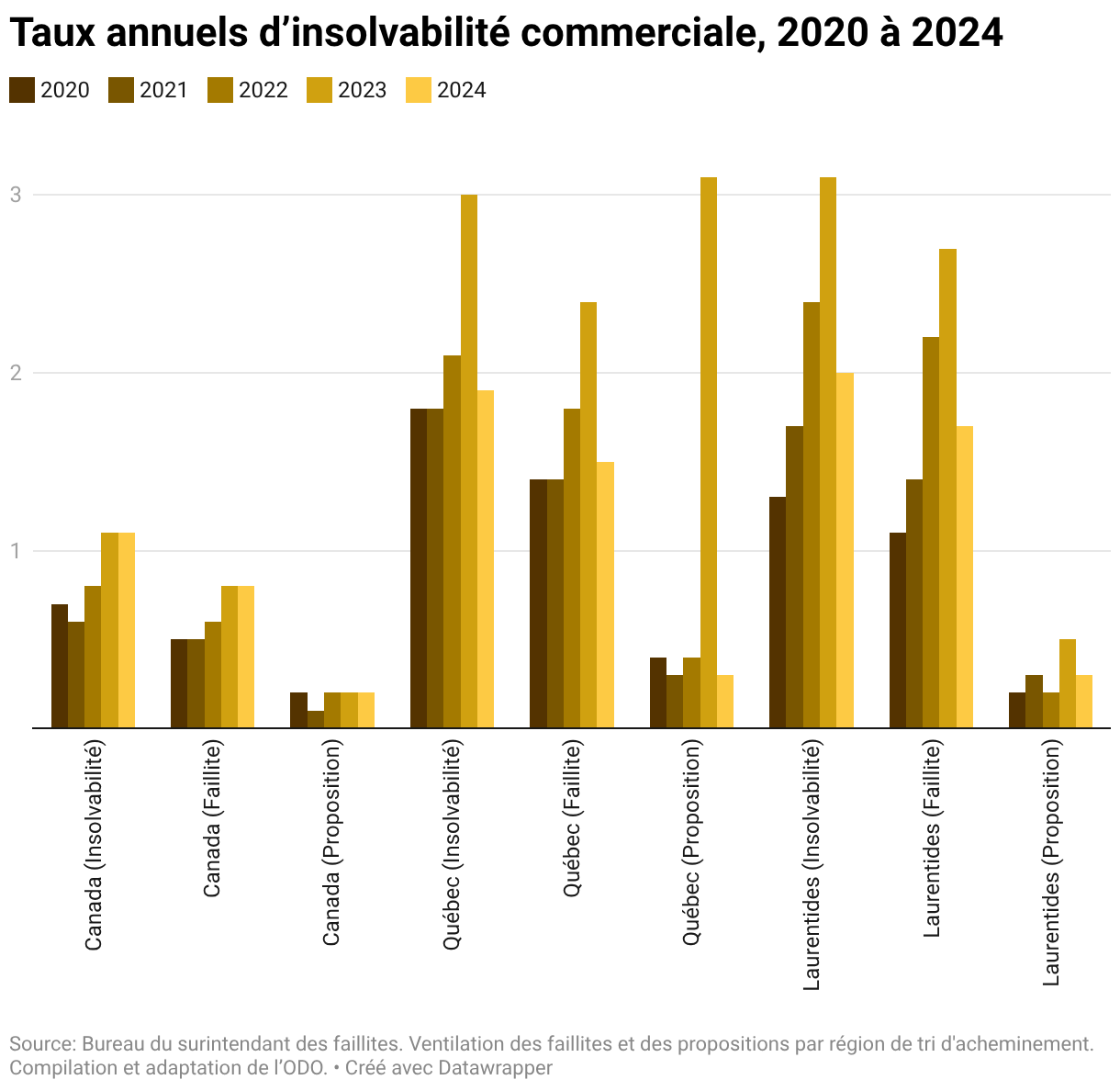 Taux annuels d’insolvabilité commerciale, 2020 à 2024