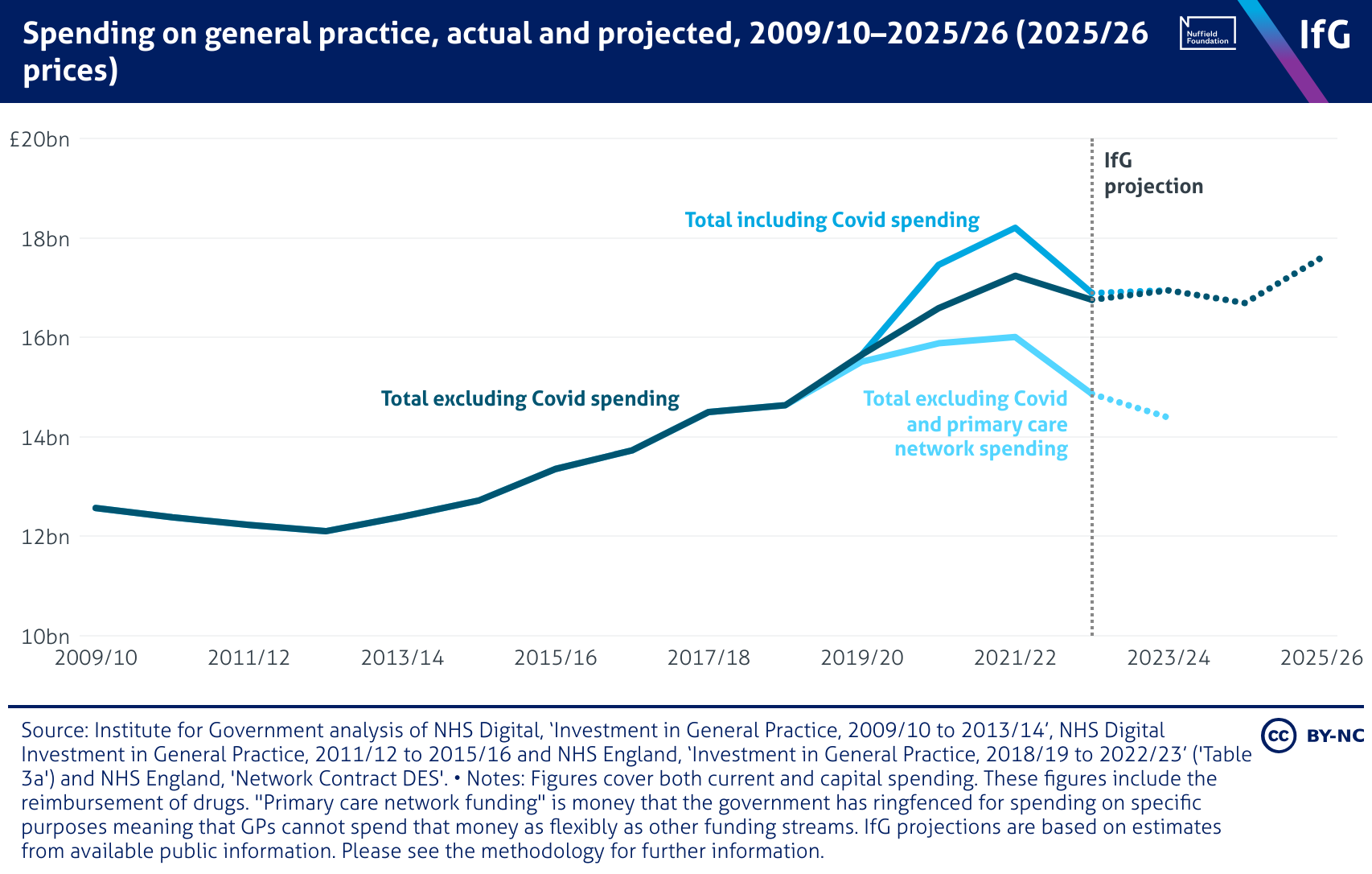 A line chart from the Institute for Government showing spending on general practice, actual and projected, 2009/10–2025/26 (2025/26 prices), where all spending grew between 2012/13 and 2021/22. All spending peaked in 2021/22, with total spend including COVID spending at £18.2 billion, £1 billion higher than spending excluding COVID spending. An IfG projection shows that total spending is expected to rise in 2025/26, while total excluding COVID and primary care network spending is estimated to fall.