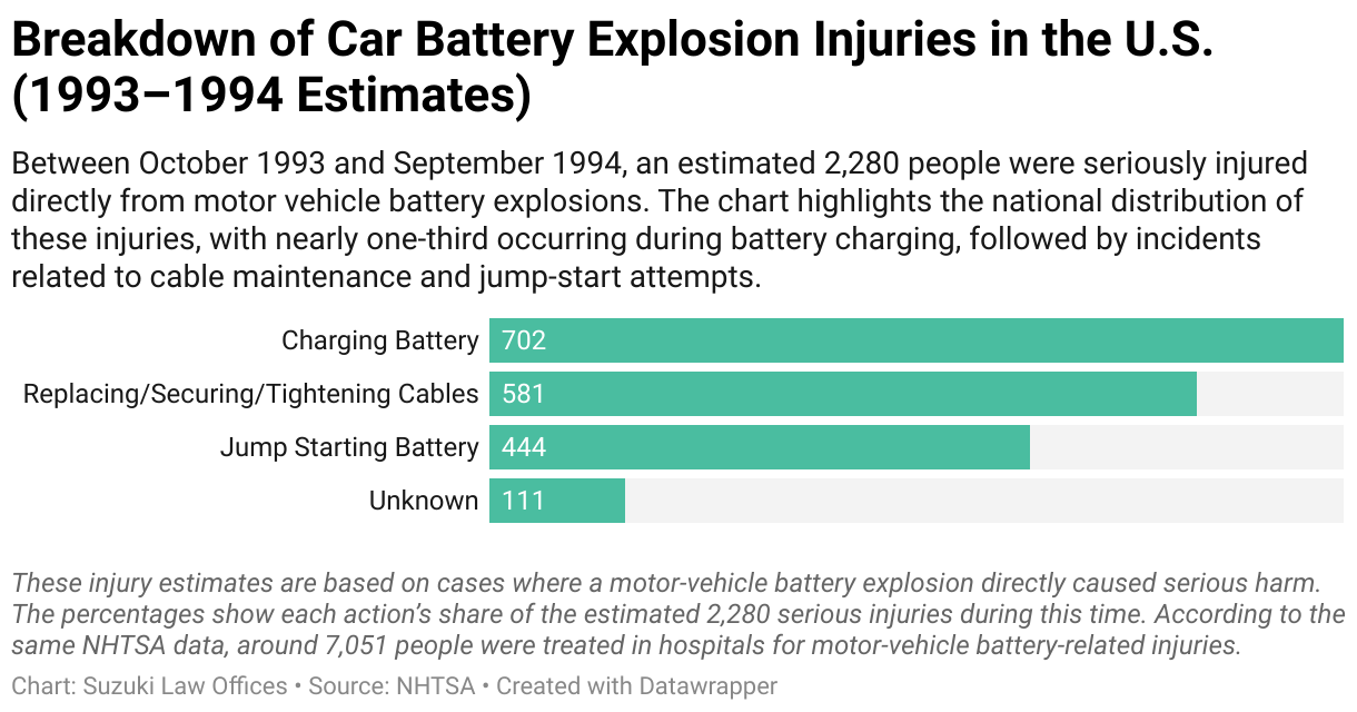 Between October 1993 and September 1994, an estimated 2,280 people were seriously injured directly from motor vehicle battery explosions. The chart highlights the national distribution of these injuries, with nearly one-third occurring during battery charging, followed by incidents related to cable maintenance and jump-start attempts.